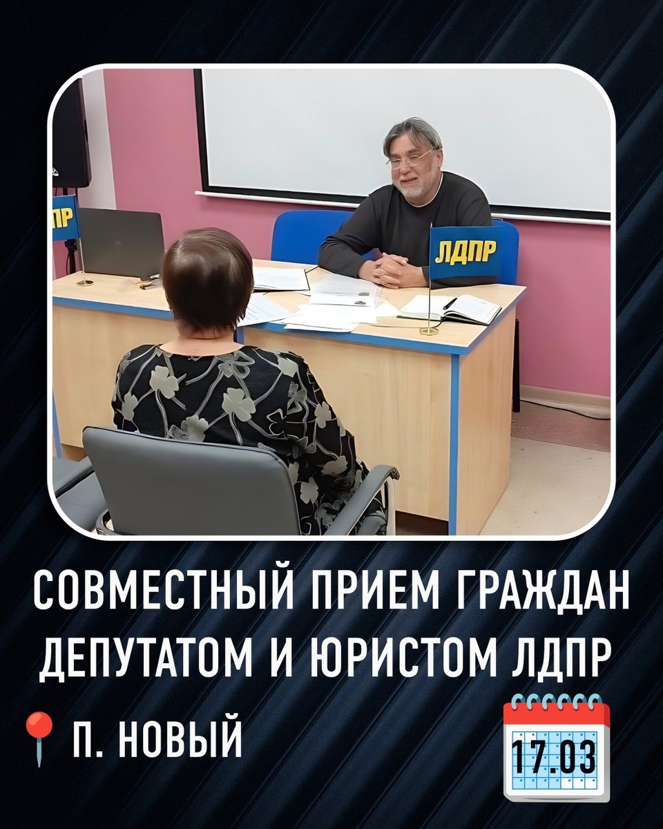 ! 📢 Завтра, 17 марта в 16:30, состоится совместный депутатский прием, где вы сможете задать волнующие вопросы и получить профессиональную консультацию. 🤝 Прием проведут: • Александр Бирюков — юрист Марийского регионального отделения ЛДПР; • Дмитрий Ясновский — депутат Пекшиксолинского сельского поселения Медведевского района. Если у вас есть нерешенные юридические проблемы, вопросы по благоустройству или предложения по развитию поселка — ждем вас! 📍 Место встречи: п. Новый, ул. Новая, д. 7 (читальный зал библиотеки). ⏰ Время: 16:30. 📞 Предварительная запись по телефону: 8 (902) 102-16-21. Вместе мы сможем добиться перемен к лучшему! 🇷🇺