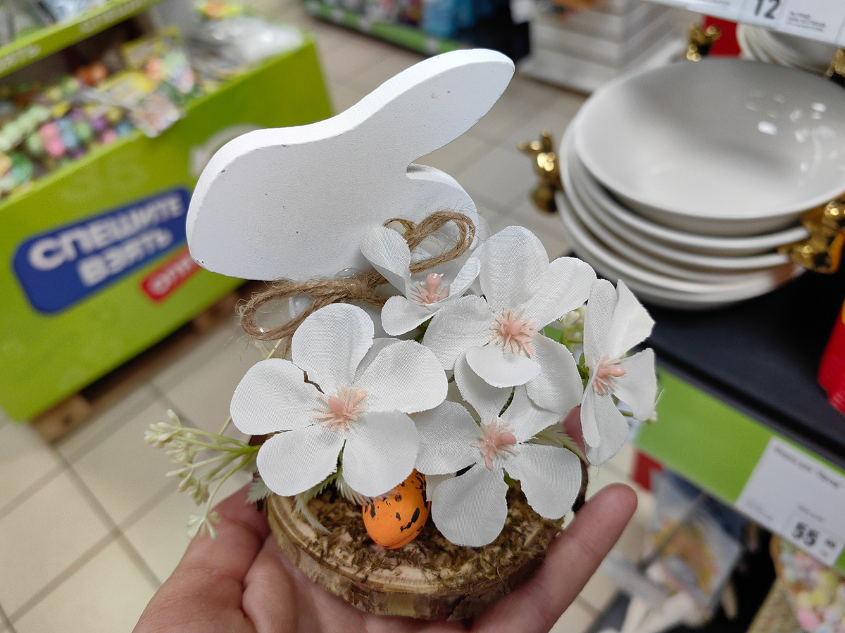 Новинка в Фикс Прайс, и не одна. Зайчик спрятался за пеньком. А на пеньке цветы и крошечные декоративные яйца. Пенек - срез дерева, натуральные материалы. Невысокий. Скорее как подставочка. Как раз к ней и прикреплены искусственные цветы и прочая декорация. Фигурка зайчика, насколько рассмотрела, тоже из дерева. Может быть белым или желто-молочным, две разные фигурки. И цветочная композиция на пенечке отличается. Пока выбирала фото для обзора Fix price, поняла, что упустила парочку новинок. Это все потому, что заставлены, прячутся в глубине полки. Насколько рассмотрела, еще выставлены белые и розовые фигурки курочек. Обязательно посмотрю, как вновь пойду в магазин. И у нас появились стеклянный зайцы. Необычные. Внутри фигурки полость, заполнена сухими цветами. Не потемнели со временем, яркие. Фигурка зайчика ровная, второй вариант с розовыми и желтыми цветами. И сам зайчик по-другому сидит. А по высоте фигурки особо и не отличаются. Пригодится к Пасхе, можно поставить рядом с ку