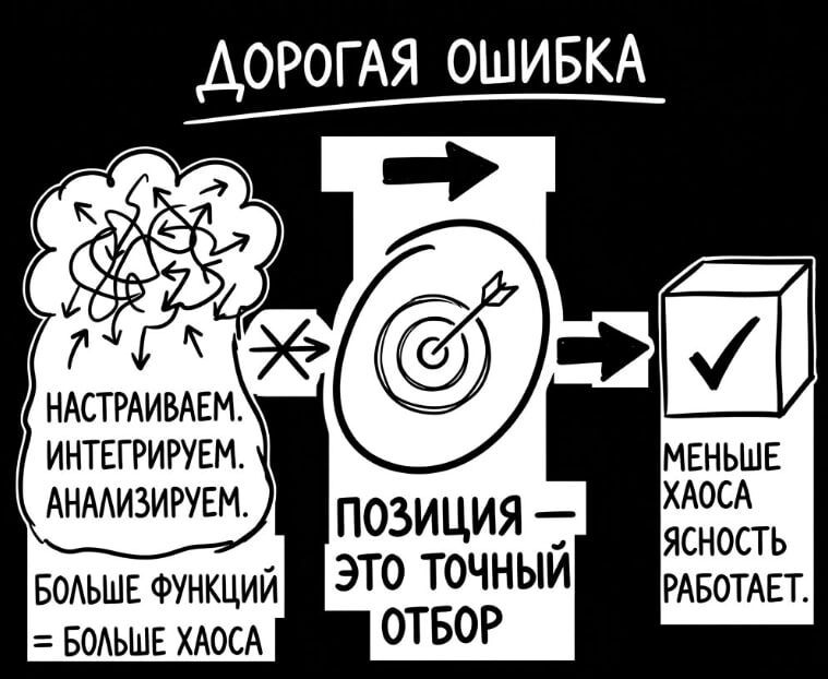 Одна из самых дорогих ошибок в позиционировании выглядит очень прилично. Из личного опыта ИТ компании. Компания хочет показать, что умеет многое. И начинает наваливать в сообщение все подряд. Настраиваем. Интегрируем. Обучаем. Автоматизируем. Сопровождаем. Анализируем. Ускоряем. Улучшаем. В свое время мне реально казалось, что так позиция становится сильнее ... 🙈 Но происходило обратное. Чем больше лишнего в формулировке, тем слабее фокус. Чем слабее фокус, тем труднее клиенту понять, зачем вы ему нужны. Сильное позиционирование - это не список возможностей. Это точный отбор. Мы не "настраиваем все". Мы убираем лишнее и собираем только то, что реально помогает бизнесу работать. Это очень важный разворот. Потому что зрелый подрядчик продает не объем действий. Он продает ясность конструкции. Не больше функций. А меньше хаоса. Не больше автоматизации ради автоматизации. А такую систему, в которой людям проще делать правильно, чем ошибаться. Именно поэтому хорошая позиция почти
