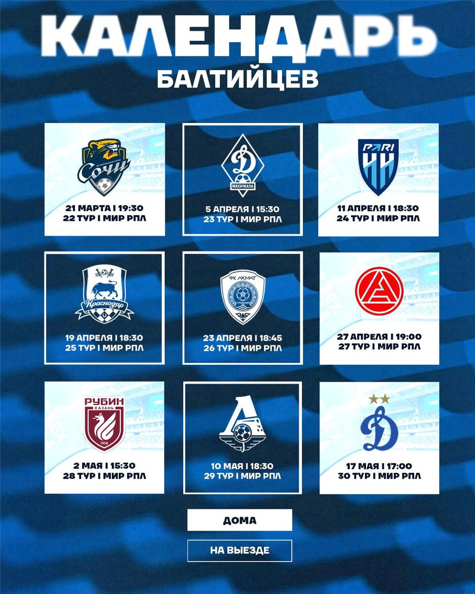 ⚽️ Премьер-лига опубликовала расписание наших оставшихся девяти матчей чемпионата до конца сезона! Это хорошая возможность распланировать свои дела сразу на два месяца вперёд 👇 🏠 21 марта (сб), 19:30 | Балтика 💙 — Сочи ⚽️ ✈️ 5 апреля (вс), 15:30 | Динамо Махачкала⚽️— Балтика 💙 🏠 11 апреля (сб), 18:30 | Балтика 💙 — Пари НН 🇷🇺 ✈️ 19 апреля (вс), 18:30 | Краснодар ⚽️— Балтика 💙 ✈️ 23 апреля (чт), 18:45 | Ахмат ⚽️— Балтика 💙 🏠 27 апреля (пн), 19:00 | Балтика 💙 — Акрон ⚽️ 🏠 2 мая (сб), 15:30 | Балтика 💙 — Рубин ⚽️ ✈️ 10 мая (вс), 18:30 | Локомотив ⚽️— Балтика 💙 🏠 17 мая (вс), 17:00 | Балтика 💙 — Динамо ⚽️ Увидимся в ближайшую субботу 🤗 🎟️️ БИЛЕТЫ