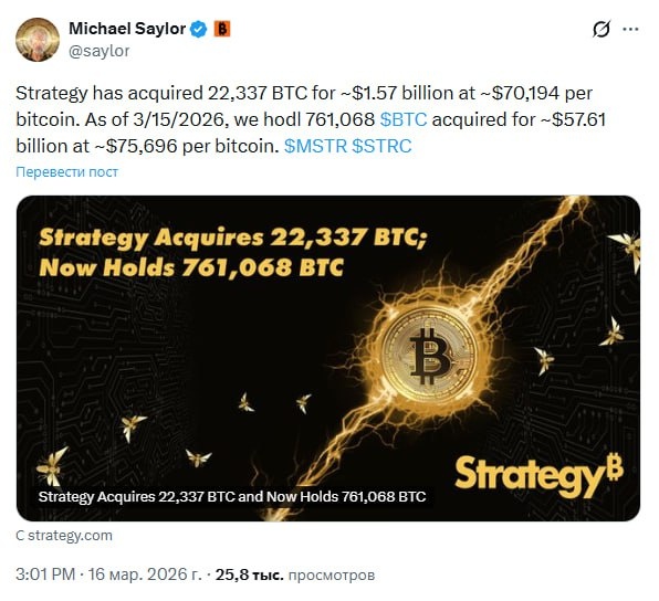 🔸Strategy приобрела 22 337 BTC на $1,57 млрд по цене около $70 194 за биткоин. По состоянию на 15 марта 2026 года компания хранит 761 068 BTC.