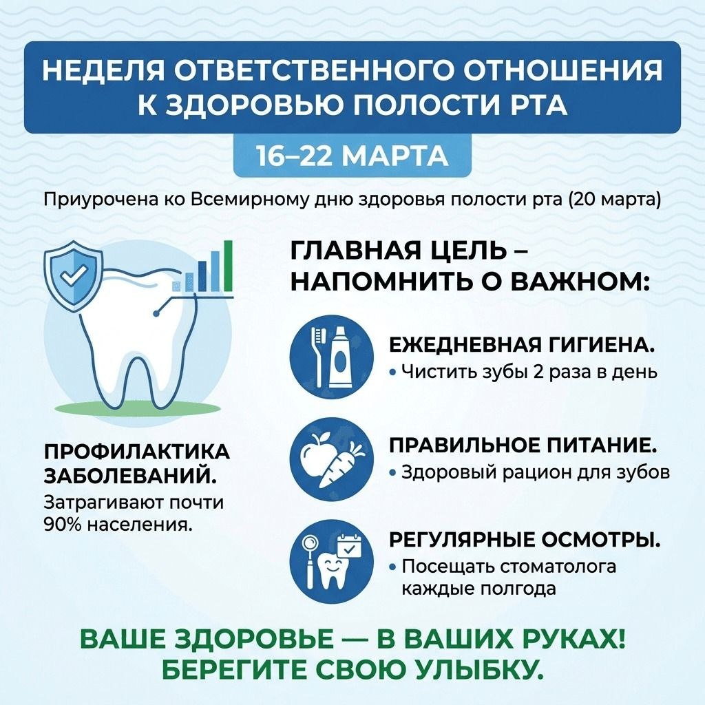 Она приурочена к Всемирному дню здоровья ротовой полости, который отмечается 20 марта. Здоровье зубов и дёсен напрямую влияет на общее состояние организма: инфекции в полости рта могут стать причиной сердечно-сосудистых заболеваний, осложнений при диабете и проблем с желудочно-кишечным трактом. Регулярный уход и своевременное обращение к стоматологу помогают избежать многих серьёзных последствий. Основные правила профилактики: чистить зубы дважды в день фторсодержащей пастой, использовать зубную нить и ополаскиватель, ограничить потребление сахара и кислотосодержащих напитков, посещать стоматолога не реже двух раз в год. Бережное отношение к полости рта — вклад в общее здоровье и качество жизни. Профилактические осмотры можно пройти в рамках диспансеризации по полису ОМС. Информация подготовлена в целях нацпроекта "Продолжительная и активная жизнь".