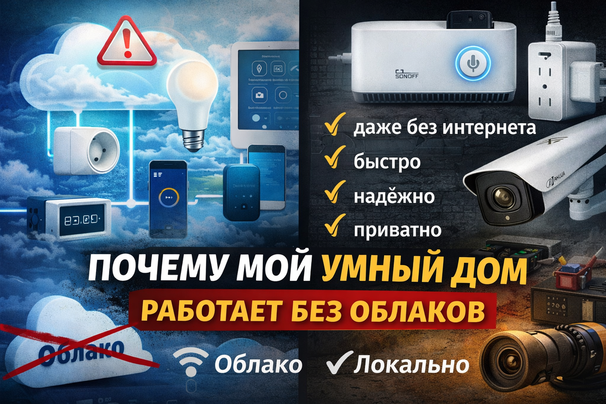 Когда люди начинают строить умный дом, они почти всегда идут по одному и тому же пути. Покупают устройство → устанавливают приложение → подключают к облаку → всё работает. Удобно. Красиво. Быстро. Но через какое-то время многие начинают замечать странные вещи: Причина обычно одна — облачная зависимость. Именно поэтому у меня почти весь умный дом работает локально. Большинство современных устройств работают по одной схеме. Когда вы нажимаете кнопку в приложении, происходит примерно следующее: телефон → интернет → сервер производителя → устройство у вас дома. То есть команда проходит через чужой сервер. Если сервер: — ваш умный дом превращается в обычный. Есть несколько причин, и они довольно практичные. Если автоматизация выполняется локально, интернет вообще не нужен. Свет, датчики, автоматические сценарии — всё продолжает работать. В моём случае центр логики — это Node-RED, который работает на локальном сервере Sonoff iHost. Все сценарии выполняются прямо внутри дома. Облачные команды