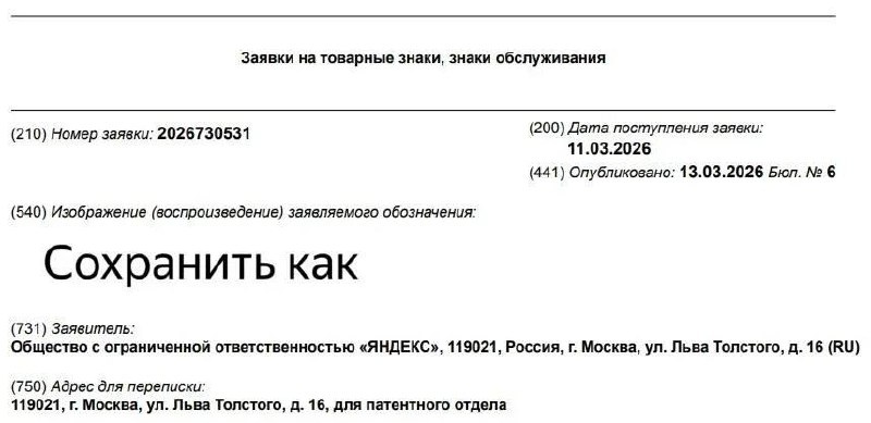 Яндекс подал заявку на регистрацию товарного знака, представляющего собой фразу «Сохранить как», узнал РуХард