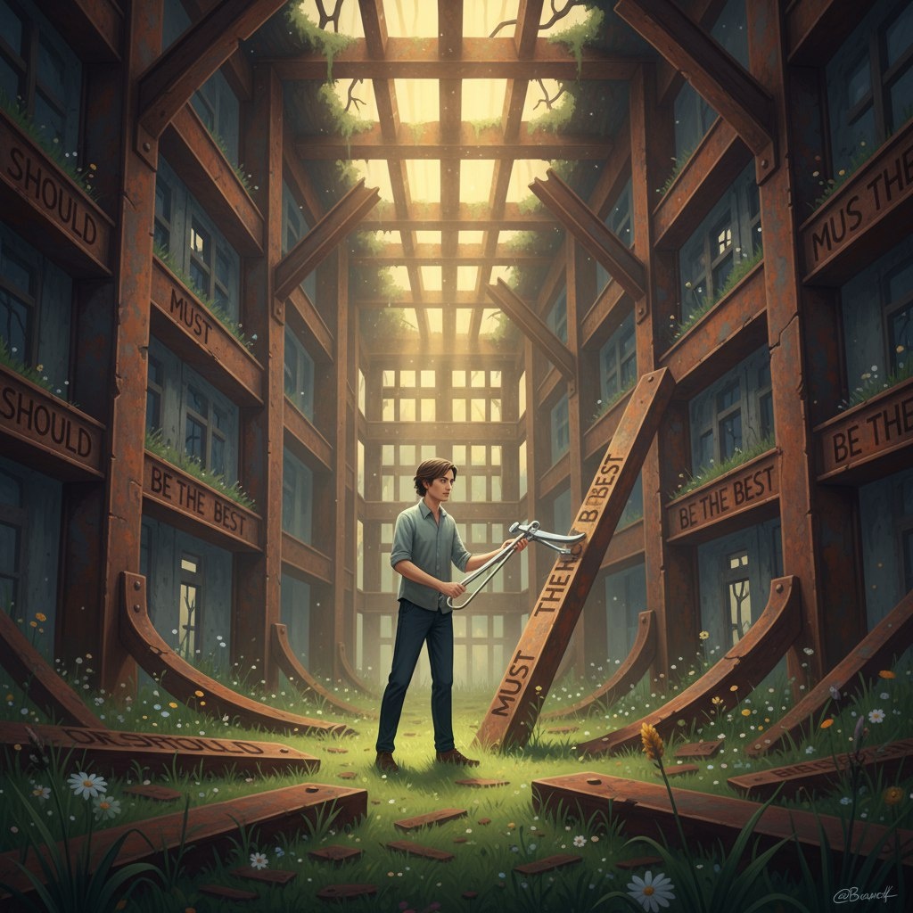 Когда мы решаем разобрать этот каркас (а часто — резко его выдернуть), здание не превращается в свободный луг. Оно теряет опору. И это пугает до паники. Наш внутренний Контролёр, который годами надзирал за выполнением правил, впадает в истерику: «Ты что делаешь?! Без этого мы развалимся! Немедленно верни список дел!».