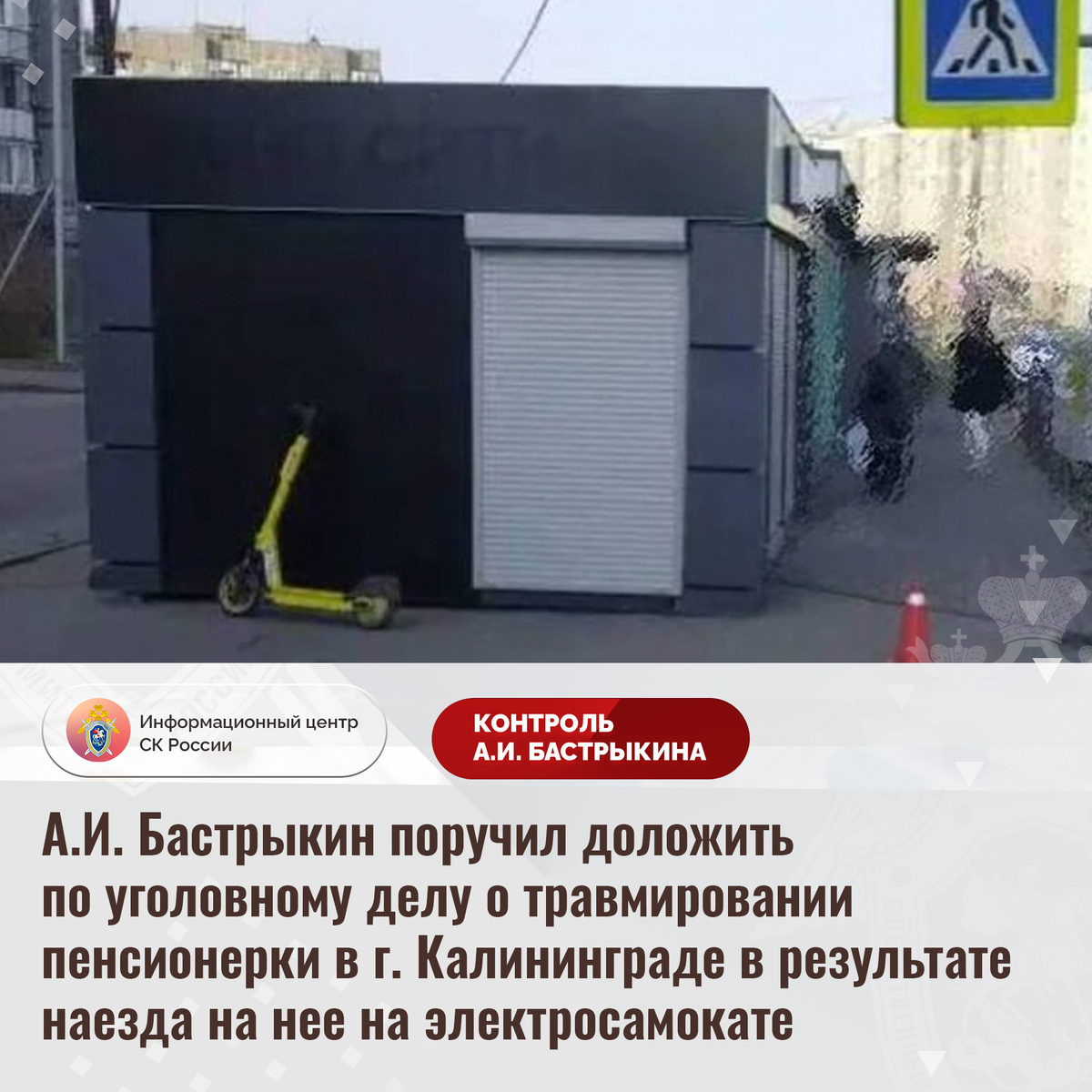А.И. Бастрыкин поручил доложить по уголовному делу о травмировании пенсионерки в г. Калининграде в результате наезда на нее на электросамокате В сети Интернет сообщается, что 15 марта текущего года в городе Калининграде водитель электросамоката сбил пенсионерку в пешеходной зоне. Пострадавшая доставлена в медицинское учреждение. В СУ СК России по Калининградской области возбуждено уголовное дело. Председатель Следственного комитета Российской Федерации Александр Иванович Бастрыкин поручил руководителю СУ СК России по Калининградской области Дмитрию Георгиевичу Канонерову доложить о предварительных и окончательных результатах расследования уголовного дела. Исполнение поручения поставлено на контроль в центральном аппарате ведомства. #СледственныйКомитет #СКРоссии #СКР #ИЦСКР #ИнформационныйЦентр #АлександрБастрыкин #ПредседательСКР #КонтрольПредседателяСКР #КомментарийКонтроль #КалининградскаяОбласть