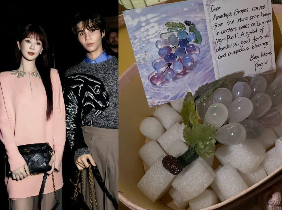 Недавно актриса Ян Цзы присутствовала на показе коллекции осень-зима 2026/27 от модного дома Valentino в Риме. Среди почётных гостей также был тайски актёр Джефф Сатур. Актёр получил от актрисы Ян Цзы необычный подарок — виноградную гроздь из аметиста. Джефф Сатур поделился фотографией в соцсетях. Актриса сопроводила подарок открыткой, которую подписала от руки:«Этот камень, вырезанный в форме винограда, в древности называли «ночной светящейся жемчужиной». Он символизирует изобилие, удачу и добрые пожелания». Ян Цзы поставила сердечко на пост Джеффа. Он ответил тем же, оставив сердечко под её записью. Смотрите также: Создатели дорамы «Судья душ в Девяти реках» ответили на споры о замене женского персонажа на мужской Также известно, что Ян Цзы подготовила особый подарок для Алессандро Микеле — креативного директора модного дома Valentino. Она привезла в Рим костюм из дорамы «Цветущий пион», выполненный в традициях династии Тан. Создатели костюма поделились этой новостью, написав: «От ис