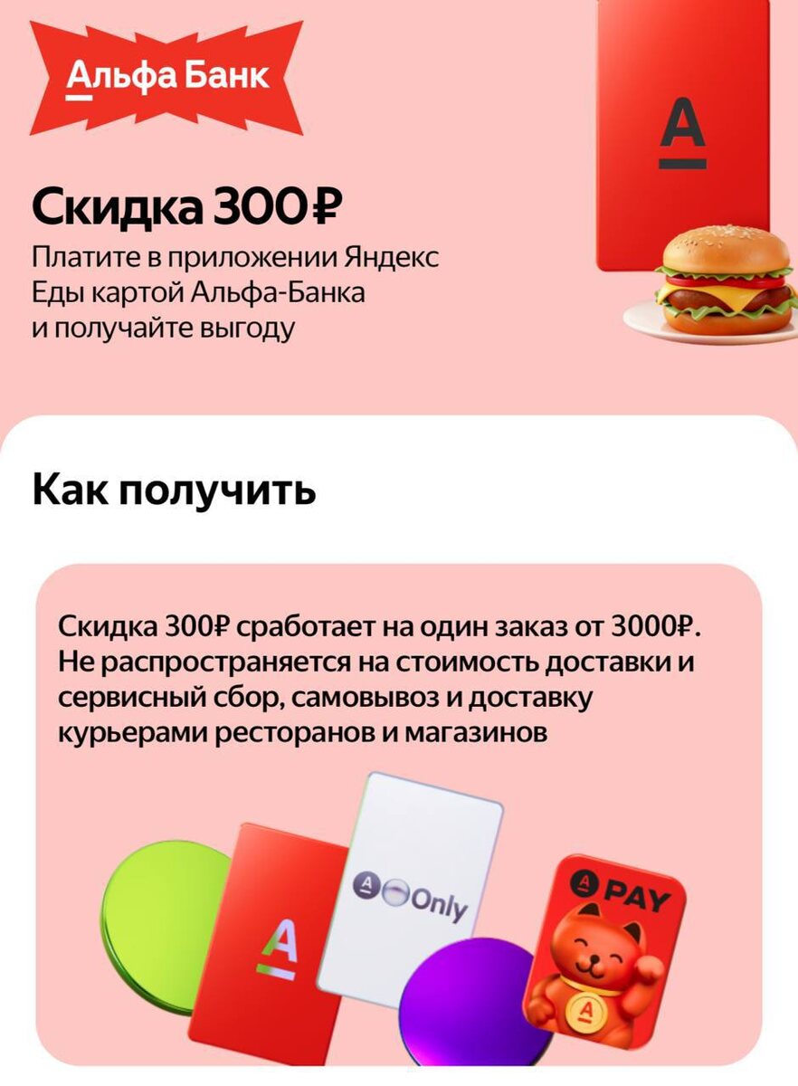 🔥 Условия: ❤️заказ от 3000₽ ❤️оплата картой Альфа-Банка ❤️скидка автоматически Важно: ❤️ не работает на доставку и сервисный сбор ❤️ не действует на самовывоз, Ultima, Яндекс Лавку 🔥 акция до 31 марта 👉Если заказ делаем в Альфа пятницу, то оплатить картой надо 🔥 от 3000₽ после всех скидок, чтобы получить кэшбэк выпавший в барабане. Полные правила акции. Промокоды для Яндекс Еды 🍔🛒🔥 📦 SHOP50 — скидка 50% на первый заказ продуктов (ВкусВилл, Лента, Пятёрочка, Магнит, Аптека Ригла и др.) 🍽️ TAKE400 — минус 400 ₽ на первый заказ из ресторанов 🎉 SALE20 — скидка 20% на заказы из ресторанов спецподборки (действует весь год) 👉Вводи при заказе и экономь 🔥