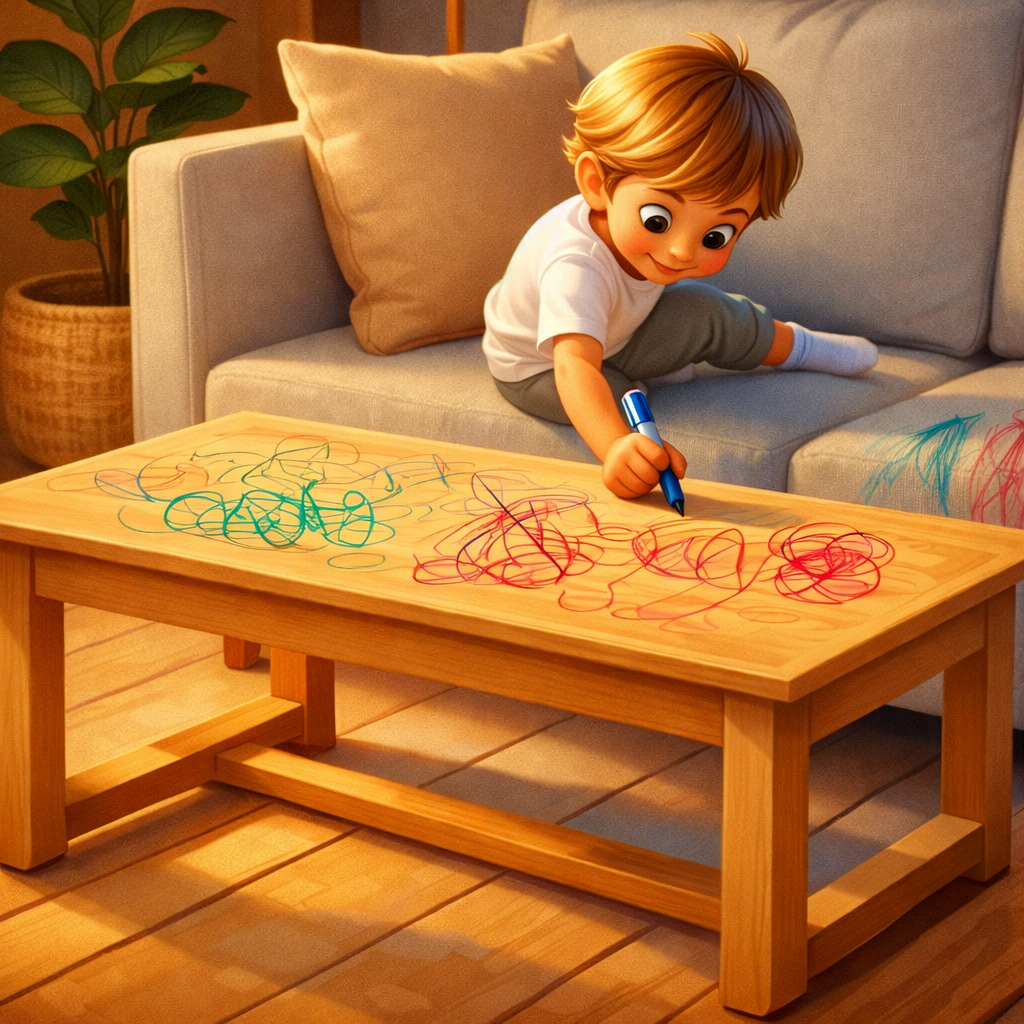 Вы возвращаетесь в комнату и видите на столе яркие линии фломастера. Хватаете влажную салфетку, проводите по следу — и вместо чистоты получаете размазанное пятно. В голове перебираете варианты: ацетон, спирт, жёсткая губка. Но каждый из них может оставить матовое пятно, царапину или липкую зону, и тогда стол испорчен навсегда.