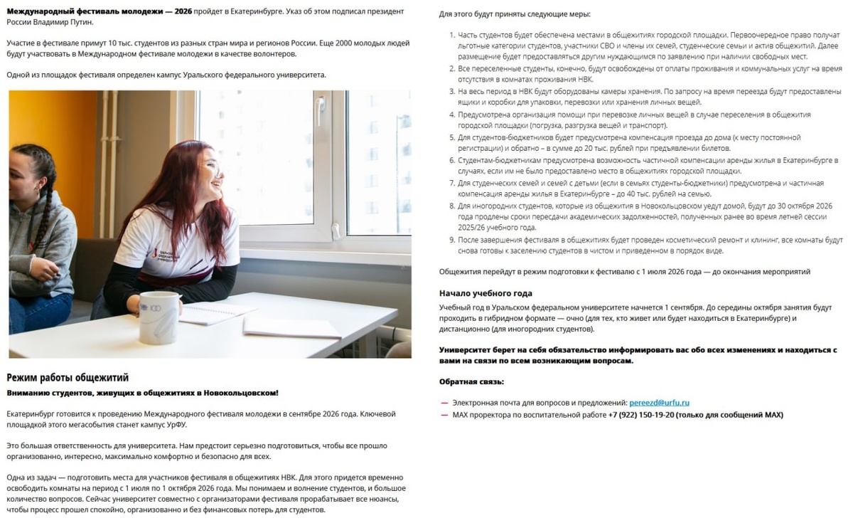 Студентов УрФУ выселяют на три месяца из общежитий — все ради международного молодежного фестиваля