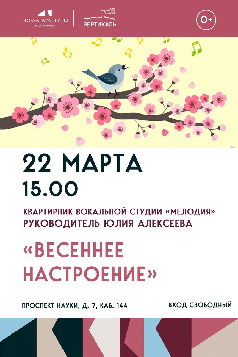 ✨ Вокальная студия «Мелодия» приглашает вас на музыкальный квартирник! 🎵Студия «Мелодия» работает в Центре уже три года. Руководитель — педагог вокала с большим стажем Юлия Алексеева. Солисты — победители и призёры фестиваля «Пущинская весна», участники городских мероприятий. ☀️Вас ждут дружеская атмосфера, любимые песни и вокальные композиции, уютное чаепитие! 🚫 Возраст: 6+ 📆 22.03.2026 🕒 15:00 🏢 ЦРК "Вертикаль" г. Пущино 📍 г.о. Серпухов, г. Пущино, проспект Науки, 7 💰 Вход свободный❗️ ⭐Поддержать канал голосом 💰 Канал Вакансии Серпухова ✅ Мероприятия Серпухов https://dzen.ru/id/66f01c6eb4c6fe60c9ca1608 https://vk.ru/serpukhov_events http://dzen.ru/serpukhov_events