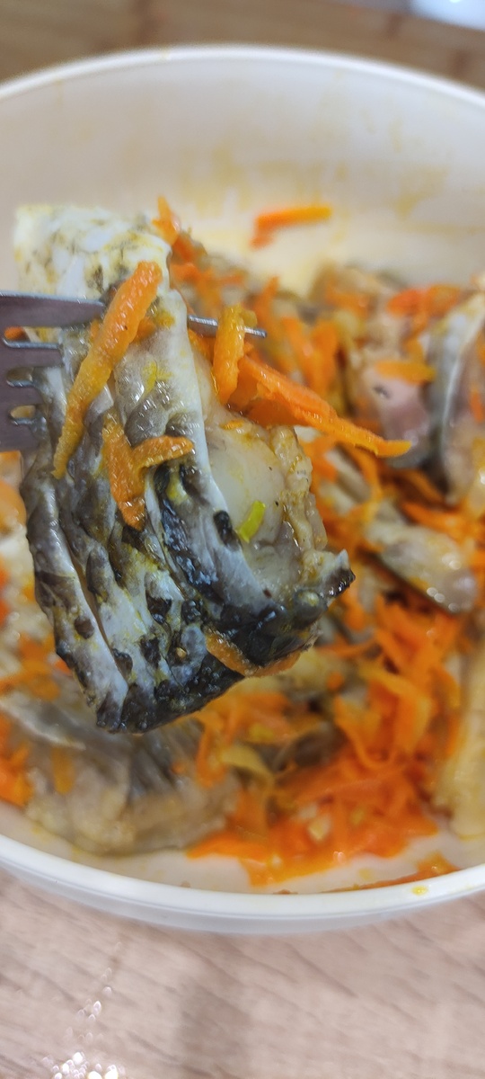 Достаем замаринованную рыбу. Сливаем с неё маринад. На сковороде обжариваем тëртую морковь и лук.