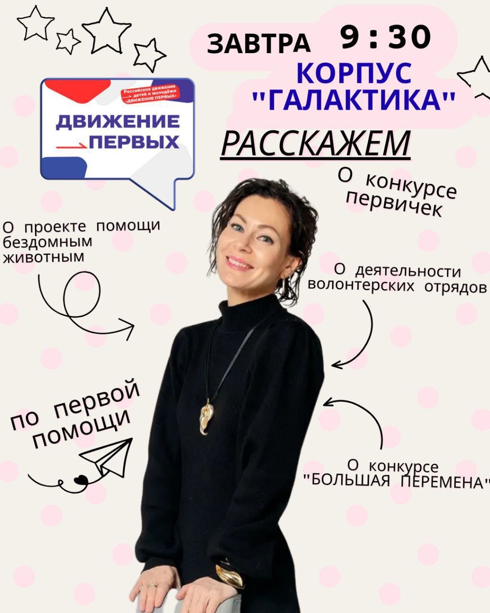 ! 🕤 Завтра в корпусе «Галактика» (Планерная 12к2) в 9:30 состоится невероятное событие! ❤️ Приглашаем всех учеников 5-9 классов на уникальную встречу с ребятами из школы СЗАО, которые расскажут о захватывающих проектах Движения Первых: волонтерство, первая помощь, конкурсы и многое другое! 🌟 Почему стоит пойти? 🔹 Узнаете, как стать настоящим героем, помогая бездомным животным или участвуя в проектах по оказанию первой помощи! 🔹 Узнаете о конкурсе «Большая перемена» – возможности развития и новых впечатлениях! 🔹 Получите вдохновение и мотивацию для участия в важных и полезных инициативах, которые делают наш мир лучше! 🫱 Не упустите шанс стать частью активных, интересных и полезных проектов! Время действовать! 👉 17 марта в 9:30 в актовом зале корпуса «Галактика». 🇷🇺Мы 🫱 в MAX! Присоединяйтесь! #ДОНМ #РоссияМояРодина #ДвижениеПервых #ДвижениеПервыхМосква #ПервыеМосква