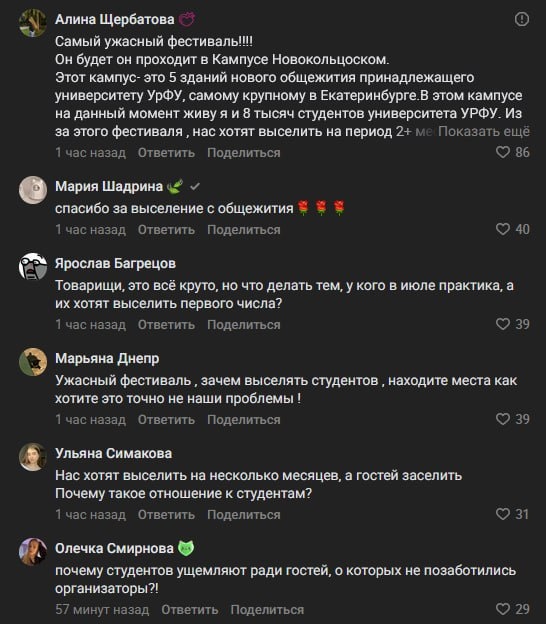 Судя по комментариям студентов в паблике фестиваля во «ВКонтакте», предложенные компенсации устроили далеко не всех В комментариях к постам они пишут, что их выселяют ради гостей мероприятия, о размещении которых, по их мнению, заранее не позаботились организаторы. При этом задаются простым вопросом — как им быть, если придется уехать.