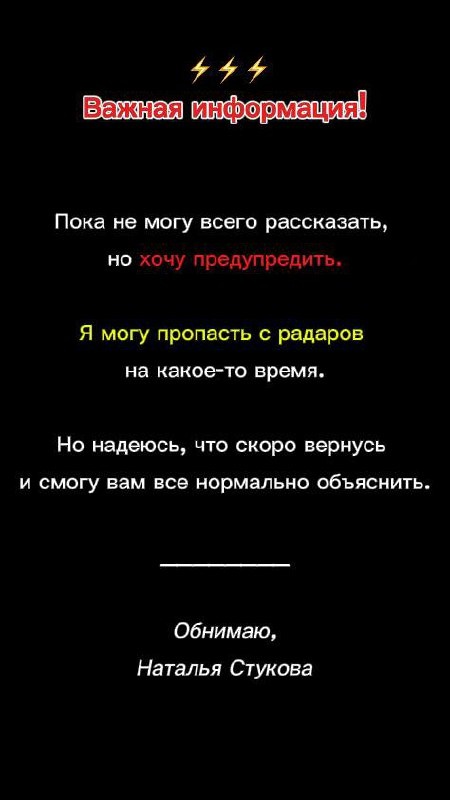 ! Пока не могу всего рассказать, но хочу предупредить. Я могу пропасть с радаров на какое-то время. Но надеюсь, что скоро вернусь и смогу вам все нормально объяснить. ____ Обнимаю, не теряйте.