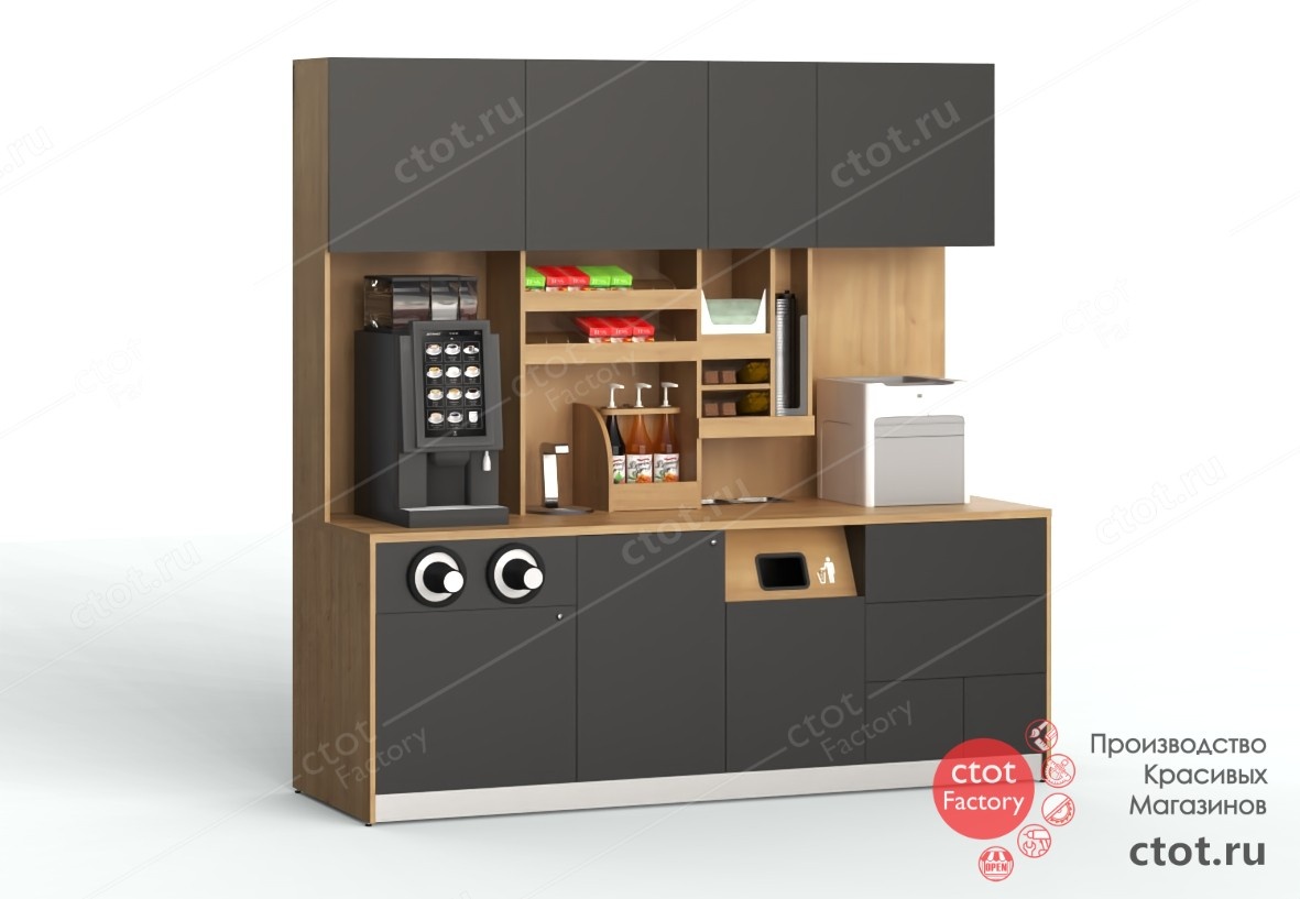 Компактные кухни становятся важным элементом инфраструктуры бизнеса. Для офисов это прежде всего комфорт сотрудников, возможность быстро сделать кофе или чай создаёт небольшую «перезагрузку» в течение рабочего дня. Такие зоны часто становятся местом коротких обсуждений и неформального общения, что положительно влияет на командную работу. Конструкция мини-кухни, разработанной фабрикой Ctot Factory, выполнена в современном минималистичном стиле: сочетание фасадов цвета Черный Графит и теплой древесной текстуры Дуба Гамильтон создаёт визуально спокойную и одновременно статусную композицию. Такой дизайн легко вписывается в разные интерьеры от офисов и шоурумов до служебных помещений магазинов, автосалонов. Открытые ниши с аккуратной подсветкой делают пространство визуально легким и одновременно удобным для использования. В них размещаются кофе, чай, сиропы, всё находится на виду и под рукой, закрытые шкафы позволяют скрыть запасы расходников. Мини-кухня выглядит как единый мебельный модуль