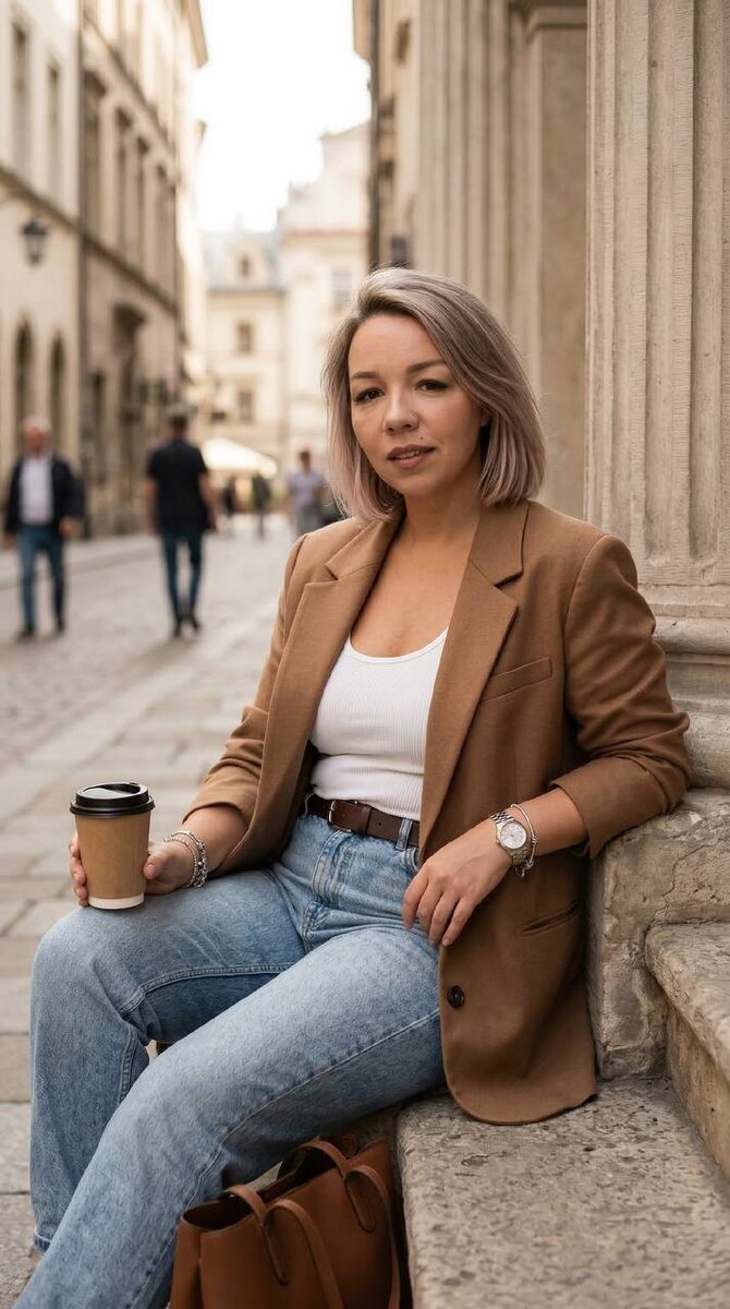 1️⃣Переходим на удобный сервис для генерации: 👉 Syntx Ai 👉 Veo3 2️⃣Выбираем дизайн ИИ/создать картинку 3️⃣Nano banana pro🍌 4️⃣Загружаем свое фото и промпт 📌ВИДЕОИНСТРУКЦИЯ ПО ИСПОЛЬЗОВАНИЮ В ЗАКРЕПЛЕННЫХ СООБЩЕНИЯХ ◾️ПРОМПТ : Стильный уличный портрет взрослой женщины , сидящей на каменных ступенях у архитектурной колонны, в расслабленной позе, слегка наклонившейся назад, в левой руке держит бумажный кофейный стакан с крышкой; кадр по пояс/бедра (вертикальный, три четверти), объект в центре композиции с лёгким смещением по правилу третей. Не меняй черты лица. Волосы цветом как на фото, короткие, но густые, с объемом у Корней. Одежда: свободный удлинённый коричневый блейзер, белая рубчатая майка, светло-голубые винтажные высокие джинсы с тёмно-коричневым ремнём; аксессуары: серебристые часы и браслеты, коричневая кожаная сумка у ног. Свет — мягкий естественный дневной свет, слегка тёплый тон, мягкие тени, деликатный контраст; настроение — элегантная повседневная уверенность