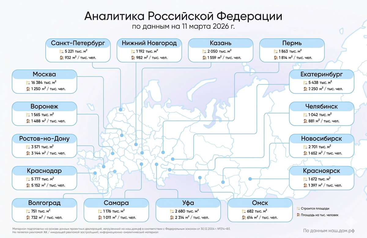 Друзья, рынок недвижимости — живой организм. Чтобы понимать, куда двигаться и где искать самые ликвидные варианты, мы постоянно следим за статистикой. На март 2026 года аналитики составили свежий рейтинг городов-миллионников по объёму строительства. Это маркер развития городов и перспективности вложений. 🥇 Москва — 16 384 тыс. м²