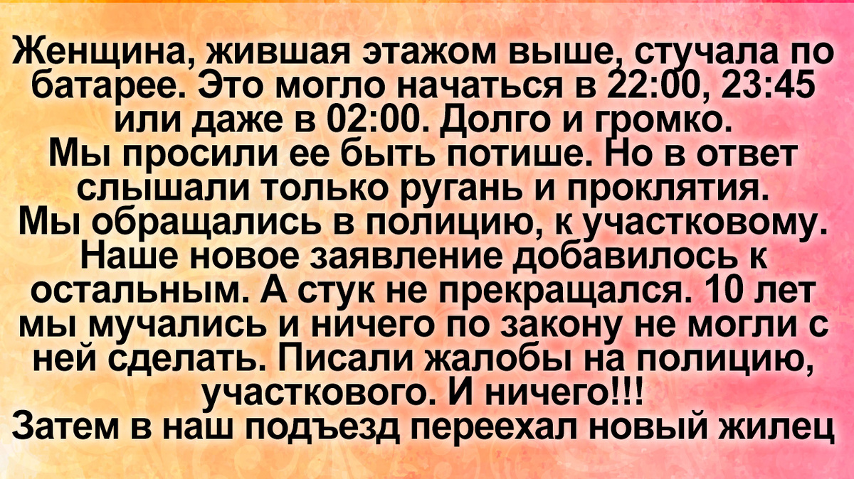 Мы обращались в полицию, к участковому. У него уже была целая папка жалоб на эту женщину. Наше новое заявление добавилось к остальным. Но стук не прекращался. уже 10 лет мы мучались и ничего по закону не могли с ней сделать. Писали жалобы на полицию, участкового. И ничего!!!
