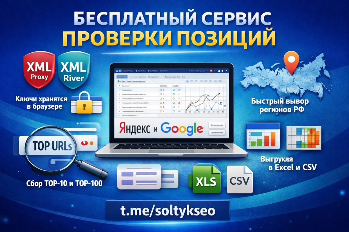 Что уже есть по факту: — проверка позиций в Яндексе и Google — для Яндекса можно использовать XMLProxy, для Google и Яндекса — XMLRiver — ключи не сохраняются на сервере, они хранятся у пользователя в браузере — на сервер сохраняются только результаты проверок и история запусков — для авторизованных пользователей есть история запусков, матрица позиций и сохранение результатов на аккаунте — можно быстро смотреть релевантный URL, TOP-1 URL и верхние URL из выдачи — есть экспорт текущего запуска в CSV, а также выгрузка TOP-10 / TOP-20 / TOP-30 / TOP-40 / TOP-50 / TOP-100 в Excel — есть быстрый выбор регионов и городов РФ То есть это уже не просто разовая проверка, а удобный рабочий инструмент, где можно: — проверить позиции сайта по списку фраз — быстро собрать верхние URL из выдачи Яндекса и Google — сохранить результаты запуска — потом вернуться к истории и посмотреть матрицу изменений https://tools.soltyk.ru/positions.php Сервис бесплатный. Если потестируете — буду рад обратной свя