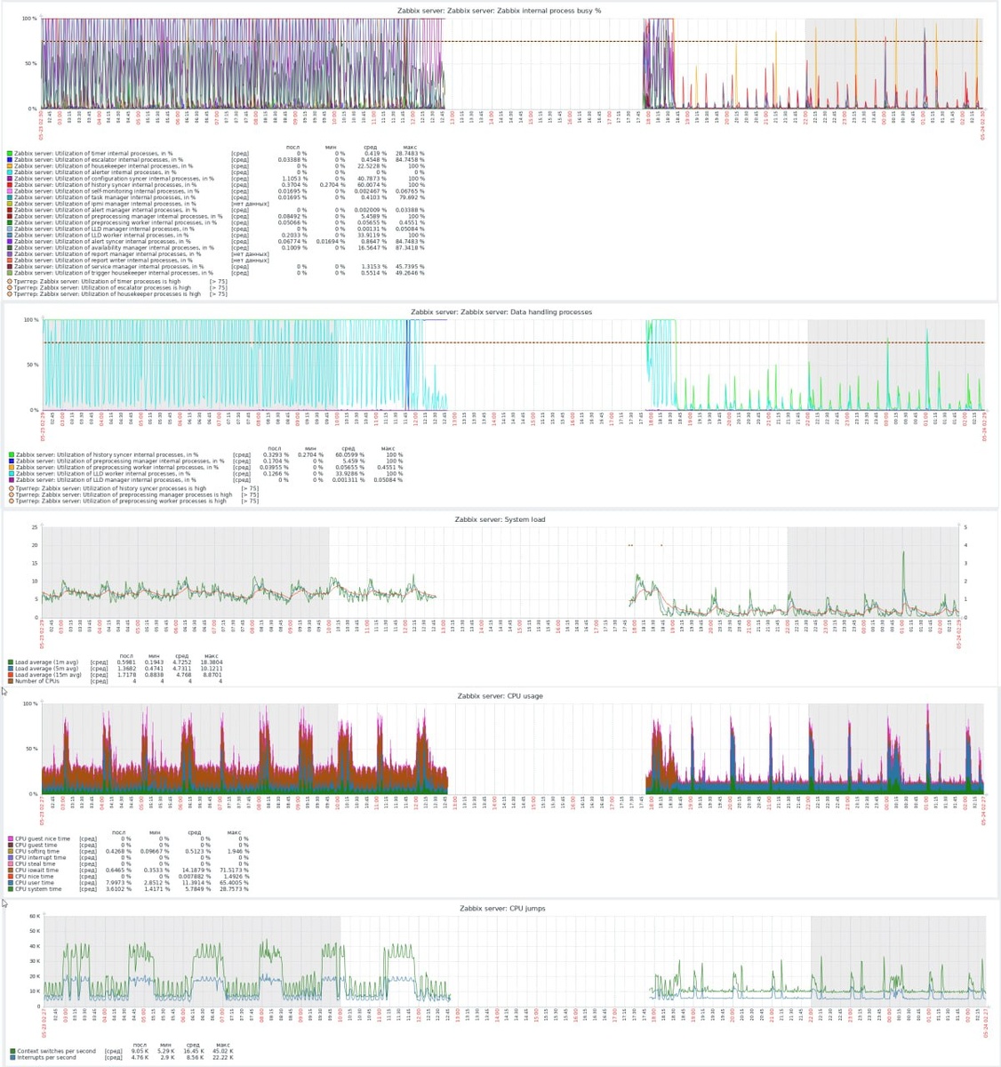 На днях у одного коллеги приключилась поучительная история. Всю неделю он оптимизировал инфраструктуру по причине покупки нового оборудования и в числе прочего решил переместить Zabbix на более мощный гипервизор, на котором как раз освободилось место. Сказано – сделано. Только вот практически сразу Zabbix начал сыпать алерты о высоком проценте использования собственных процессов. А тут коллега, ровно перед переездом, добавил на мониторинг около 35 новых узлов с чем и связал выросшую нагрузку. Беда эта известная и в интернете полным-полно инструкций какие опции нужно крутить для того или иного процесса. Только вот инструкции почему-то не помогали и через пару часов «оптимизации» Zabbix вообще упал. После чего была использована опция «звонок другу» и мы решили восстановить контейнер из бекапа, благо с этим было все в порядке. Сразу обратили внимание на необычно высокий LA, который для двух выделенных контейнеру ядер показывал просто неприличные значения. При этом никакой вычислительн