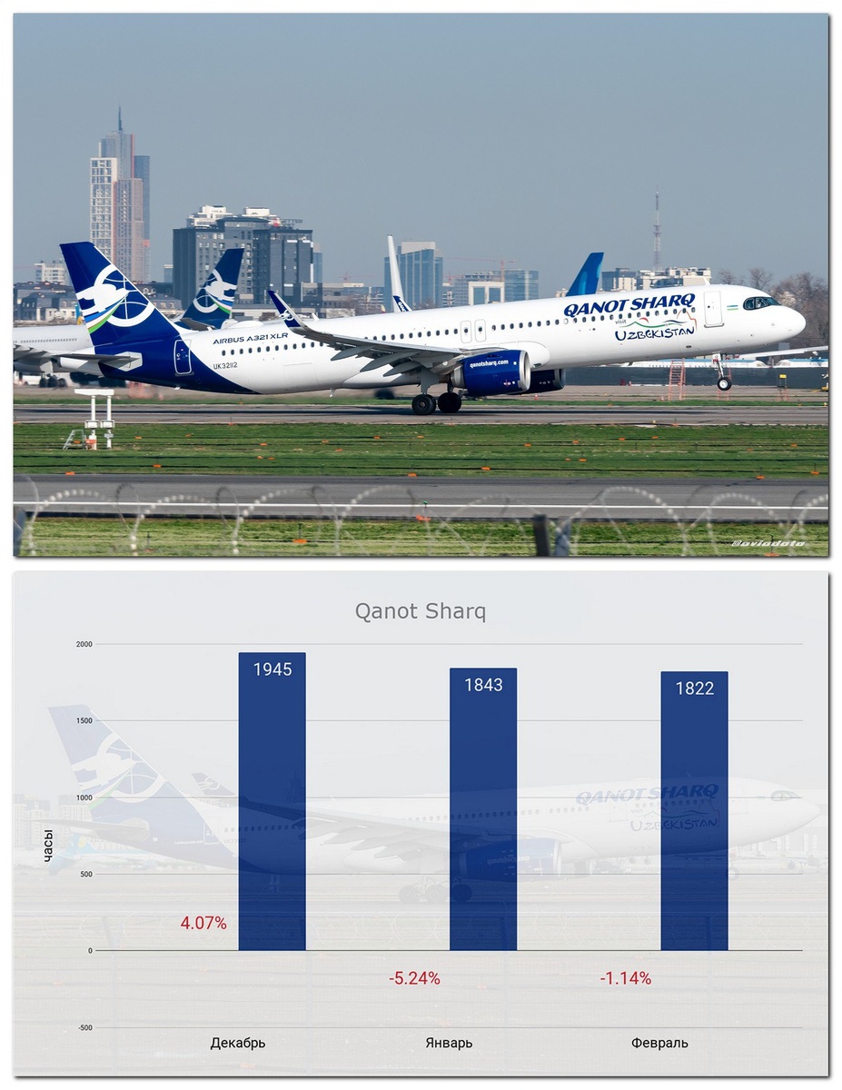 В феврале общий налёт самолётов авиакомпании изменился незначительно. Среднесуточный налёт на одно воздушное судно увеличился ⬆️ на 9.44% и составил 9.17 часа. Суммарное количество часов налёта воздушных судов авиакомпании Qanot Sharq за февраль уменьшилось ⬇️ на 1.14% по сравнению с январём и составило 1822 часа. Общая динамика за последние 3 месяца представлена на графике. #статистика #qanotsharq #февраль2026