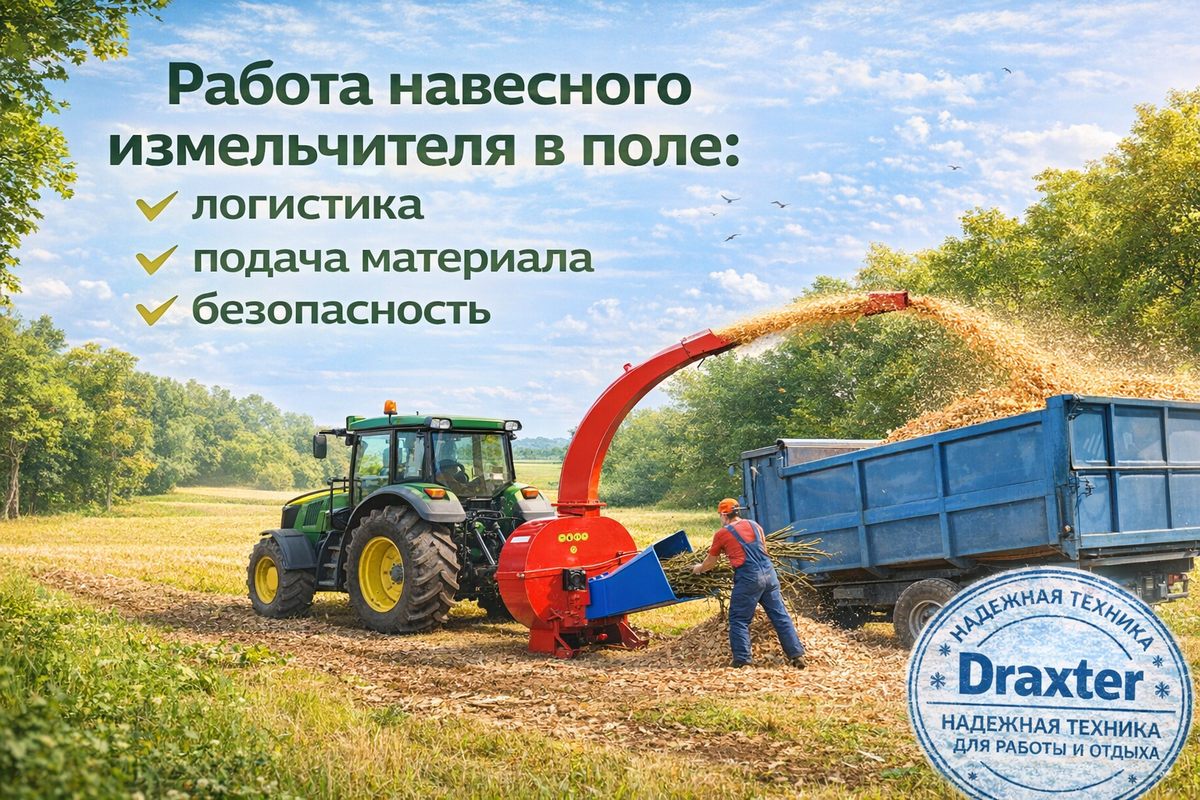 Когда расчистка территорий проходит в поле, лесополосе или на удалённых участках, использование обычных садовых измельчителей становится неудобным. В таких условиях намного эффективнее применять навесной измельчитель с приводом от вала отбора мощности трактора (ВОМ). Такая техника подключается к трактору и позволяет перерабатывать ветки, кустарники и древесные остатки прямо на месте. Это значительно упрощает работу: не нужно перевозить ветки на склад или площадку переработки — измельчение веток происходит непосредственно в поле. Навесные модели, например Draxter У-650 и У-950, применяются для расчистки территорий, уборки веток после вырубки деревьев и обслуживания лесополос. Принцип работы техники достаточно простой. Измельчитель подключается к трактору через вал отбора мощности. Двигатель трактора передаёт вращение на ножевой диск машины. Далее процесс выглядит так: 📌 Основные этапы работы В результате ветки превращаются в щепу, а объём отходов уменьшается в несколько раз. Для работы