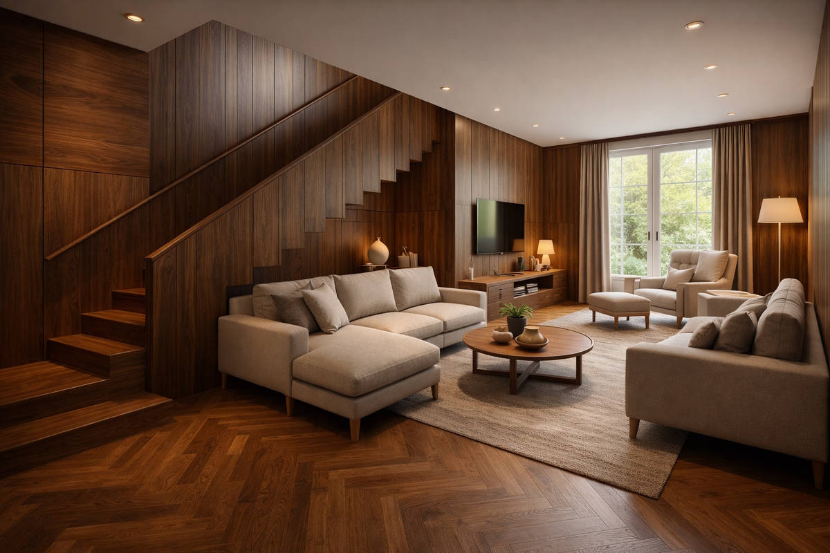 Есть оттенки, которые приходят и уходят вместе с модой. А есть материалы, которые формируют саму атмосферу пространства. Орех относится именно к таким решениям: это и выразительный древесный цвет, и самостоятельная порода дерева со своим характером, глубиной текстуры и ощущением тепла, которое невозможно спутать с другими покрытиями. Если вы ищете материал, способный объединить пол, лестницу и стены в единую архитектурную композицию и сразу придать интерьеру завершенность, в «Viva Parquet» можно заказать исполнение из ореха для всех ключевых элементов пространства — паркета, стеновых панелей и лестничных конструкций. Такой подход позволяет изначально строить интерьер вокруг благородной древесины, а не подбирать решения уже после ремонта. Орех ценится не только за цвет. Это древесина с выразительным природным рисунком, мягкими переходами оттенков и глубокой текстурой, которая выглядит сложнее и благороднее по сравнению со многими другими породами. Главные особенности ореха в интерьере: