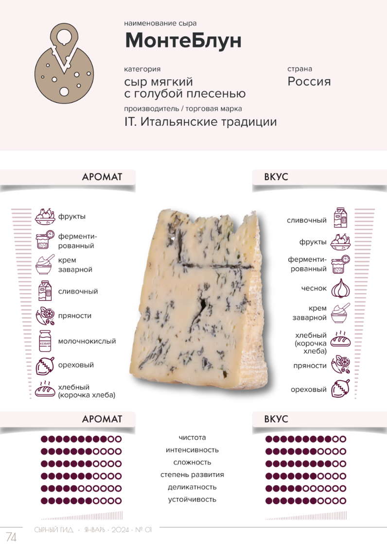Сырная тарелка - сочетание разнообразных видов сыра, гармонично дополняющих друг друга. Как правило, в сырную тарелку включают разной степени зрелости и текстур. От мягких и нежных до твердых и пикантных. Один из способов удивить гурманов - это разнообразить сырную тарелку сырами с плесенью. Аромат сыра чистый, достаточно интенсивный. В аромате выделяются тона фруктов, ферментированный, заварного крема, сливочный, пряный, дополняемые молочнокислым, ореховым нюансами и нюансом корочки хлеба. Вкус сыра сладковатый, с хорошей кислотностью, соленый, со слабой горчинкой, с маслянистой жирностью, приятной остротой. Вкус сыра достаточно полный, баланс сдвинут в сторону сладкой и жирной составляющих. Сыр подойдете для дополнения сырной тарелки. Аромат сыра умеренной интенсивности и сложности. В аромате выделяются тона ржаного хлеба, сливочный, сметаны, дополняемые нюансами прелых фруктов и животным (от корки сыра). Вкус сыра еле сладкий, с хорошей кислотностью, солоноватый, нежирный, умеренн