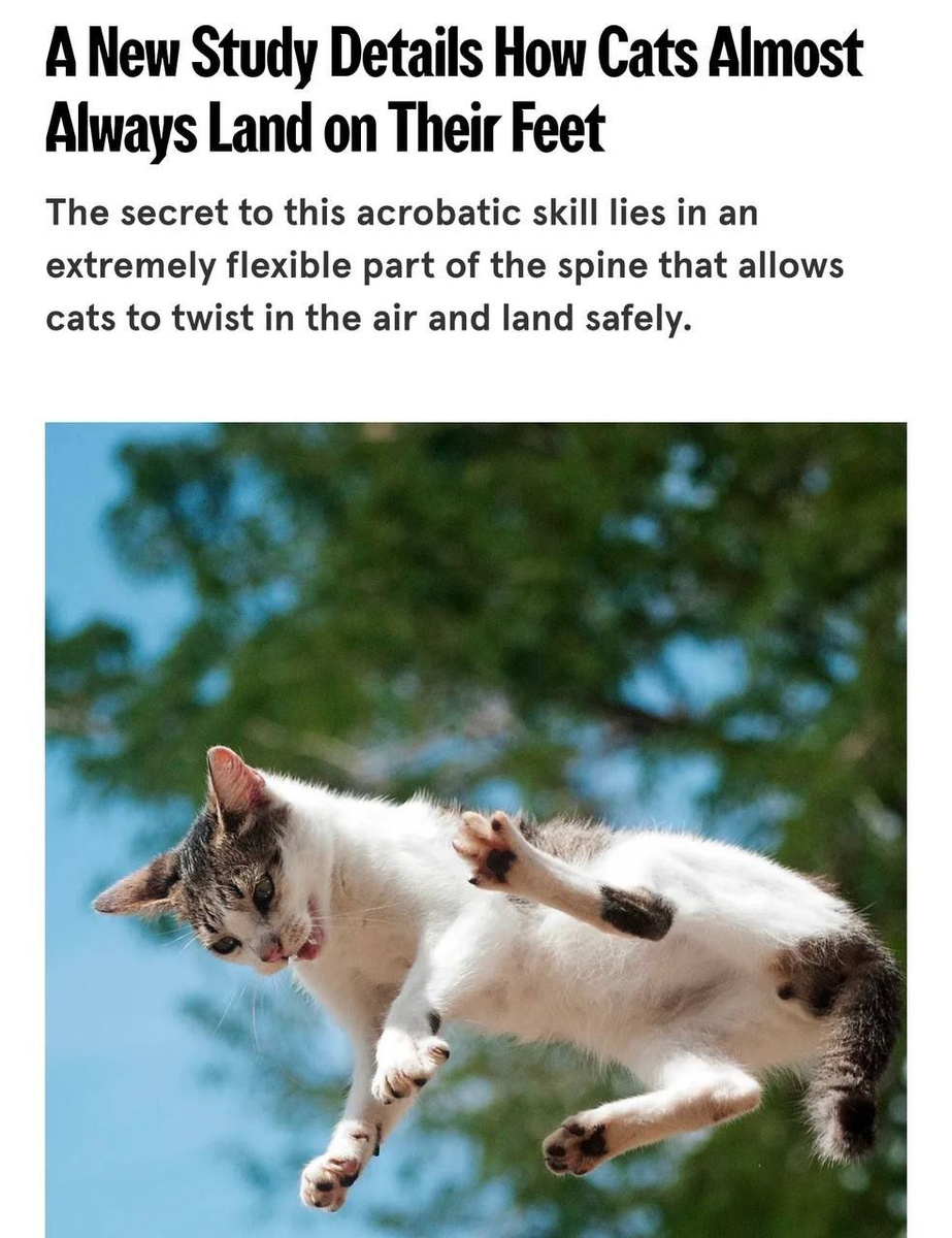 ? 🐈⬛ Все дело в уникальном строении их позвоночника. Верхняя часть – невероятно гибкая, а нижняя – жесткая. Благодаря такой конструкции, кошка может последовательно вращать частями тела в полете, выравниваясь перед приземлением. Это происходит автоматически, на уровне рефлекса! 🤸♀️ "Кошки – настоящие мастера баланса!" И это не просто забавная особенность! Результаты исследований могут помочь в создании ловких роботов, способных сохранять равновесие при падении. 🤖 Новое для тебя 👉@mikenimoff