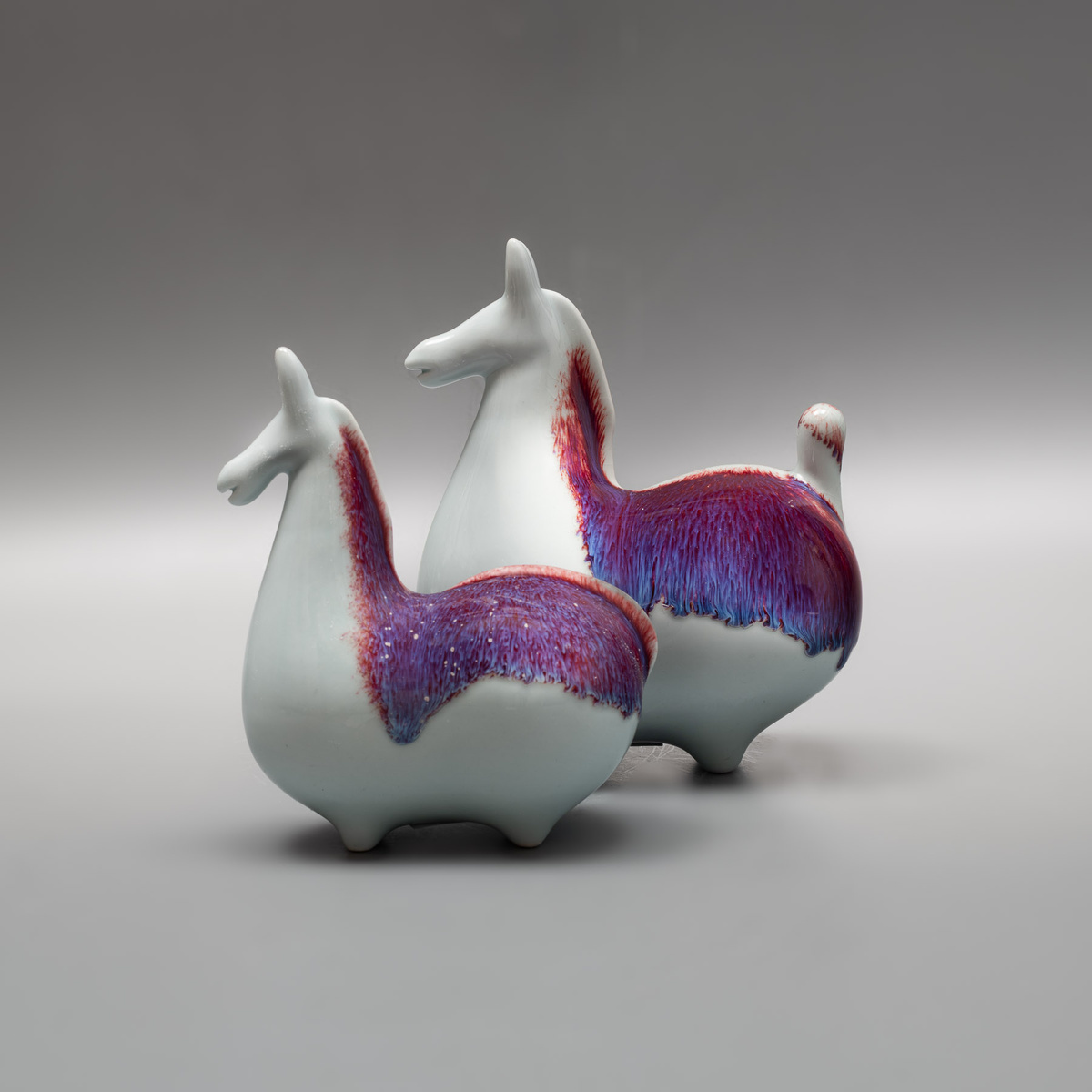 Спины и гривы покрыты стекловидным слоем с переливами от малинового к глубокому фиолетово-синему. Цвет растекается свободно, образуя живые потёки и градиенты. Благодаря этому поверхность ловит свет, и фигуры начинают играть оттенками. В китайской культуре образ коня связан с энергией движения, удачей и благоприятными переменами. Недаром классические «танские кони» считаются одним из самых узнаваемых символов китайской художественной традиции. Но есть ещё