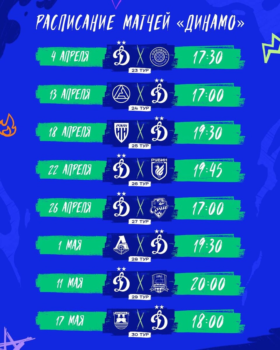 23-й тур: 4 апреля, 17:30, «Динамо» — «Оренбург»;