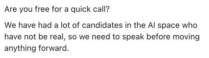 Пишет сегодня рекрутер в LI, предлагает консалтинговую роль на фрилансе. Отлично общаемся, спрашиваю про следующие шаги. На что он просит созвониться, чтобы понять, что я живая. Интересно, а как это выглядит, когда кандидаты ненастоящие? Профиль оформляют на одних, а работу выполняют другие? Забавно, ничего не скажешь.