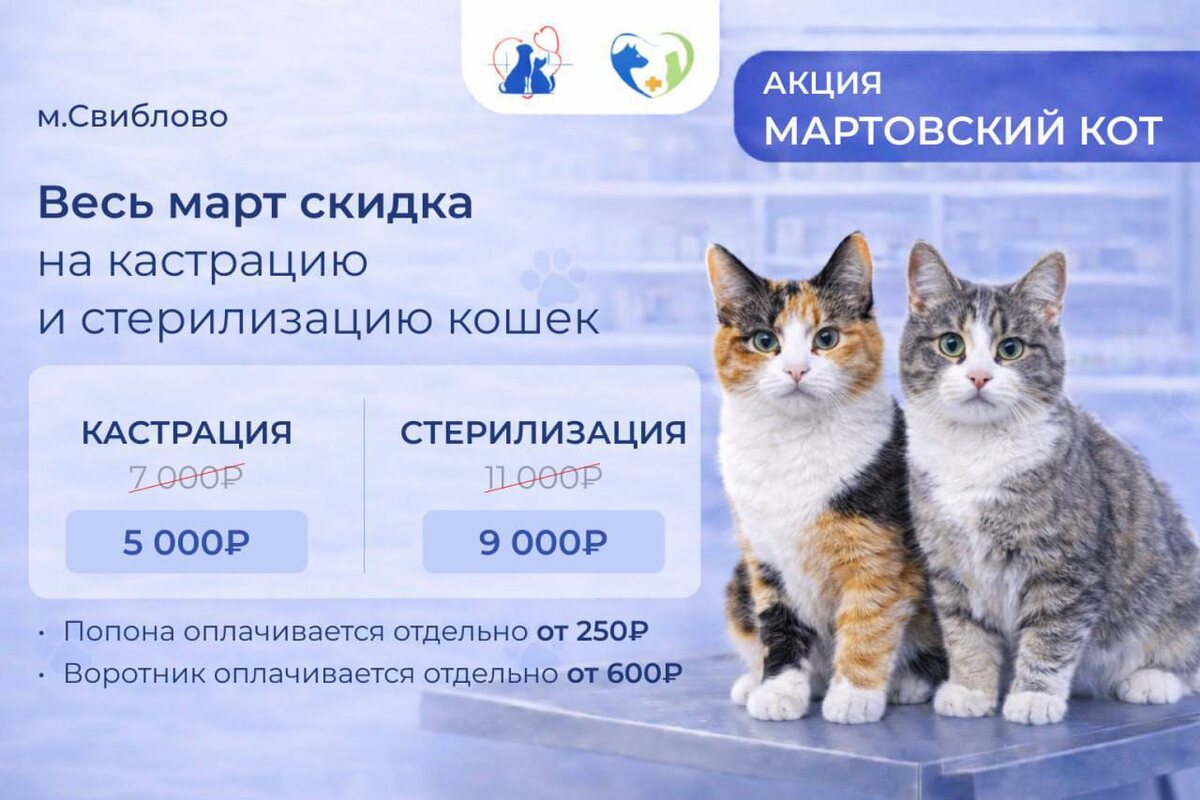 Снежной д13к1 (м.Свиблово) В течение всего марта в клинике действует специальная стоимость на кастрацию и стерилизацию кошек. Это хорошая возможность провести операцию по выгодной цене и позаботиться о здоровье питомца. Подробности акции и стоимость — на баннере 👆 Обратите внимание: • попона и защитный воротник оплачиваются отдельно Записаться можно по телефону клиники или на сайте. 📍 м. Свиблово ул. Снежная, д. 13к1 8 (495) 181-34-74 Онлайн-запись на прием Мы Вконтакте 📱 Мы в МАХ 📱