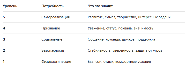 Вы замечали, как по-разному люди реагируют на одни и те же вещи? Кого-то вдохновляет похвала, а кто-то её не замечает. Кому-то важна команда, а кто-то держится особняком. Один готов работать за идею, другому нужна только стабильная зарплата. Почему? Потому что у каждого из нас — своя актуальная потребность. И объясняет это простая и гениальная теория — пирамида потребностей Абрахама Маслоу. Это не абстрактная схема из учебника, а рабочий инструмент, который помогает понимать себя, мотивы коллег, реакции начальника и даже причины семейных конфликтов. Потребности человека выстроены в иерархию. Пока не удовлетворены нижние уровни, верхние нас не мотивируют. Главный принцип: Нельзя мотивировать человека признанием, если он не уверен в завтрашнем дне. Нельзя требовать командного духа, если люди боятся увольнения. Проведите диагностику по пяти уровням. Найдите самый дефицитный — именно он тянет всё остальное вниз. Уровень 1 (тело):