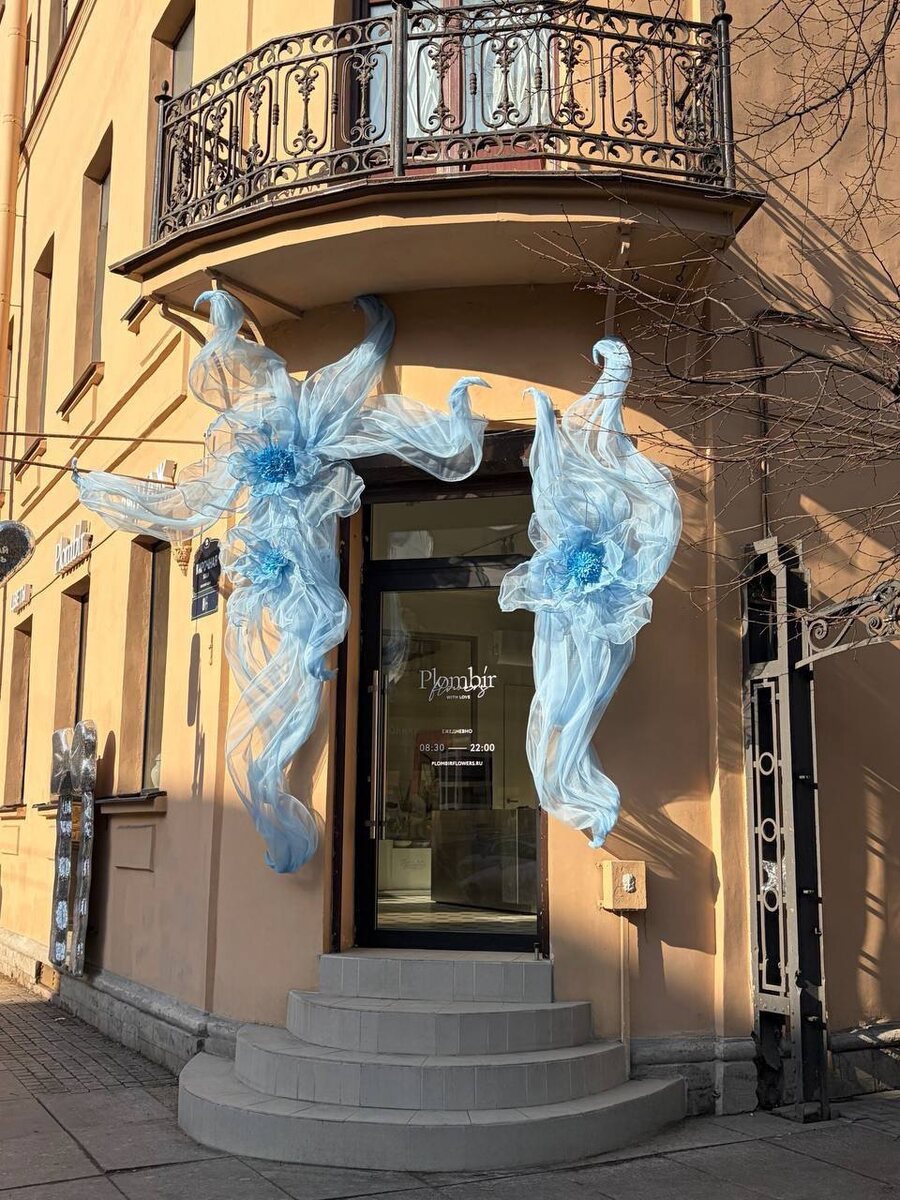 У входа в Plombir Flowers настала настоящая весна. Фасад магазина превратился в легкую цветочную инсталляцию: огромные голубые бутоны будто распустились прямо в воздухе. Цветы выполнены из полупрозрачного тюля, поэтому свет мягко проходит сквозь лепестки и создает ощущение невесомости. Получилась очень нежная и атмосферная локация — идеальный фон для ваших весенних фотографий. Кто-нибудь уже видел этот необычный фасад? Делитесь фото в комментариях. 📍Кирочная, 8Б #локация Вокруг Питера Я в ТГ | Я в MAX | Я в VK