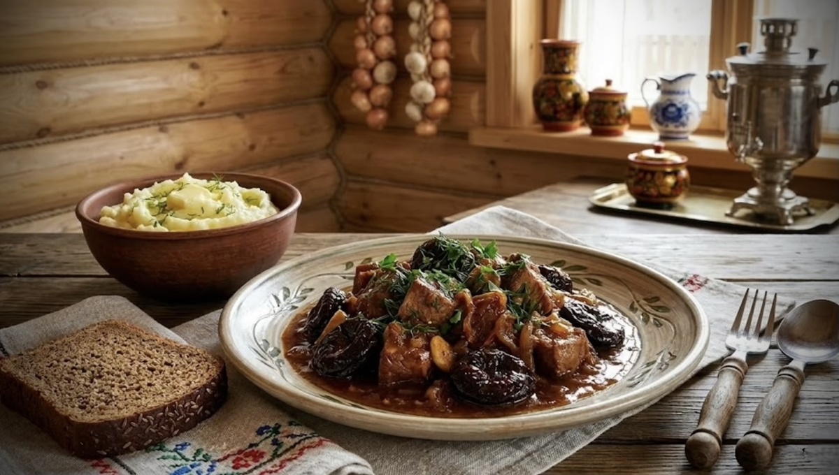 Такое блюдо выглядит довольно простым, но в нём есть особая домашняя элегантность. Нежные кусочки мяса, густая подлива и мягкие кусочки чернослива создают очень гармоничный вкус.