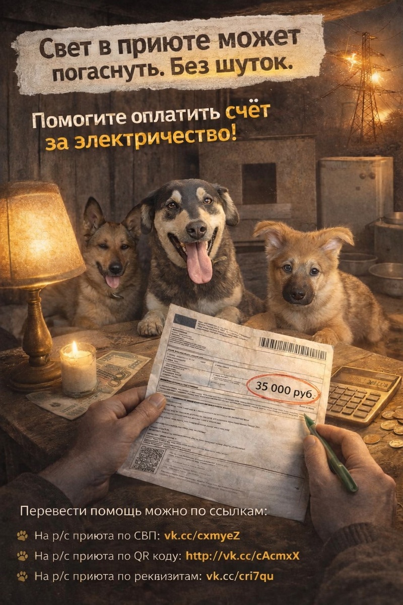 А свет нам нужен не для красоты. Без него не будет освещения в вольерах, где живут уличные собаки. И самое страшное, погаснет свет в вагончиках, где живут наши инвалиды и кошки. Они замёрзнут без обогревателей, останутся в темноте. Нам нужно собрать 35.000 рублей до конца недели. Любая копейка сейчас спасает жизнь: 100 ₽ - освещение в вольере на всю ночь 300 ₽ - сутки тепла для инвалидов в вагончике 500 ₽ - возможности даже в темное время суток следить за состоянием наших хвостиков Как помочь? На р/с приюта по СБП: https://vk.cc/cOCEWL На р/с приюта по QR коду: https://vk.cc/cOCEZE На р/с приюта по реквизитам: https://vk.cc/crI7qu Отчет по сбору: https://vk.cc/cUzEYZ Если нет лишней суммы - помогите репостом. Мы очень надеемся на вас.