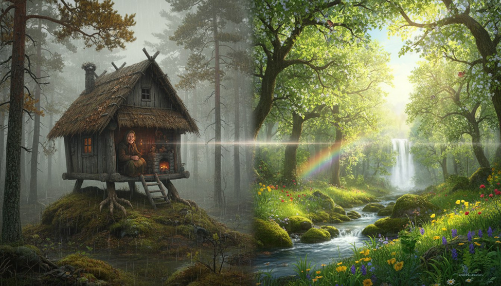 На самой окраине леса, где сосны уже сменяются холодным болотным мхом, стояла избушка на курьих ножках. Жила в ней Баба-Яга. Не злая, нет. Просто очень-очень старая и уставшая. Её мир давно застыл в вечной, сырой осени. Листья на крыше избушки были бурыми, дождь моросил не переставая, а в печи, сколько ни топи, веяло лишь скудным теплом былого. А по ту сторону леса бушевала Весна. Она раскрашивала мир в цвета, которых Яга и забыла названия: цвет молодой травы, неба после дождя, первых одуванчиков. Оттуда доносился смех ручьёв, щебет вернувшихся птиц и тот особый, пьянящий запах теплой земли. И вот однажды Весна, смелая и безрассудная, заглянула на болотную окраину. Увидела унылую избушку и старую женщину у окна, которая смотрела в сторону её, Весны, царства пустым, выцветшим взглядом. - Что с тобой? - спросила Весна, и вокруг неё на мгновение расцвел даже серый мох. - Всё ушло, - прошептала Яга. - И краски, и тепло, и смысл. Осталась только тишина да сырость. Я бы всё отдала, чтобы сно