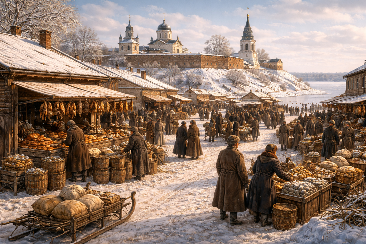 На берегу огромного северного озера стоит небольшой русский город, который помнит времена древних князей и торговых путей. Это старинный город — Белозерск. Сегодня он выглядит тихим и спокойным, но когда-то был важным центром торговли и ремёсел. Через него проходили дороги между севером России и крупными торговыми городами. Белозерск возник на берегу огромного водоёма — Белое озеро. Именно это озеро определило судьбу города на многие столетия. Озеро было частью древних водных путей. По нему шли лодки и барки, перевозившие товары между северными землями и центральной Россией. В XIX столетии Белозерск уже не был большим торговым центром, но его положение по-прежнему оставалось важным. Через Белое озеро проходили водные маршруты, по которым двигались грузы и товары. Сюда приходили барки и небольшие суда, нагруженные хлебом, лесом, тканями и рыбой. На пристанях кипела жизнь. Рабочие разгружали барки, купцы проверяли товар, а извозчики готовили телеги для перевозки грузов дальше по дорогам