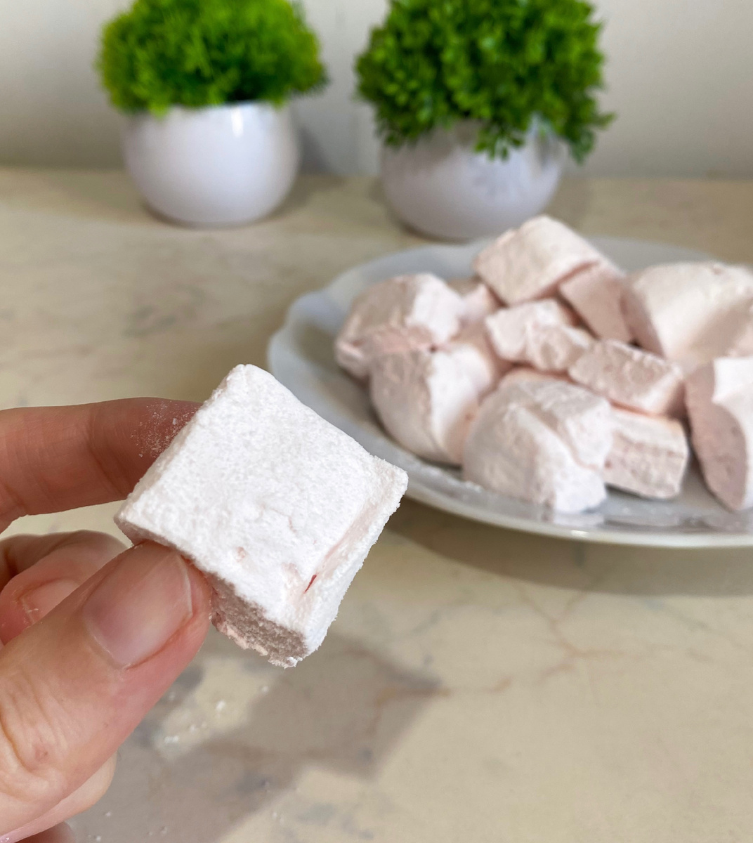 - После полной стабилизации разрезаем наше маршмеллоу на кусочки и обсыпаем смесью крахмала и сахарной пудры