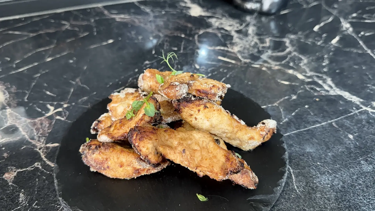 Всем привет! Приготовим стрипсы в аэрогриле. Ингредиенты: - Куриная грудка (филе) - Соевый соус - Соус Терияки - Сок лимона - Паприка сладкая - Соль по вкусу - Черный молотый перец (по желанию) - Панировочные сухари или измельчённые овсяные хлопья Приготовление: 1. Подготовка куриной грудки: - Разделайте целую курицу, оставив только филе. - Нарежьте филе на полоски шириной около 2 см и длиной примерно 8-10 см. 2. Маринад: - Добавьте в нарезанное филе соевый соус, соус Терияки, лимонный сок, паприку и соль по вкусу. - Перемешайте всё хорошо руками, чтобы маринад равномерно распределился по кусочкам. 3. Панировка: - Подготовьте панировочные сухари либо мелко размельчите овсяные хлопья. - Обваляйте каждую полоску курицы в панировке. 4. Приготовление в аэрогриле: - Выставьте температуру аэрогриля на 200°C. - Готовьте стрипсы в течение 20 минут. Результат: Получаются вкусные и хрустящие стрипсы, идеально подходящие для быстрого ужина или перекуса. Приятного аппетита!