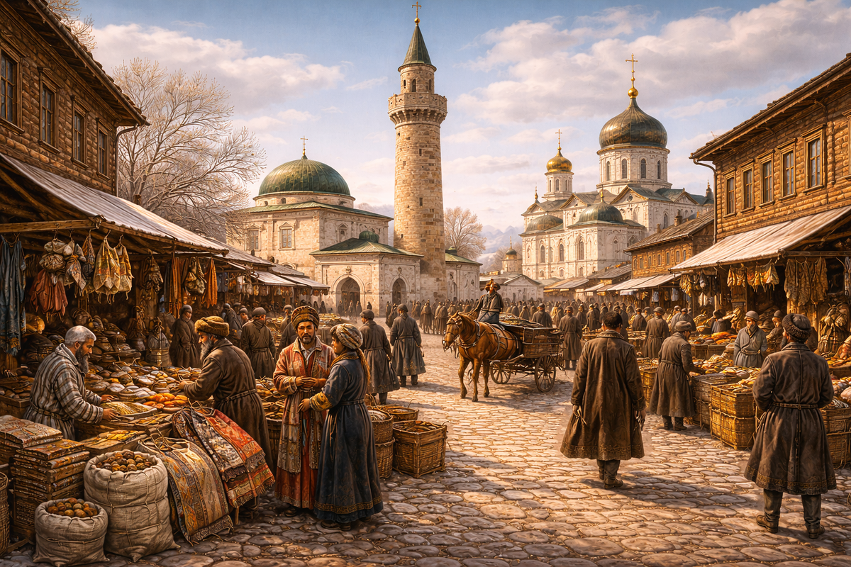 На высоком берегу реки стоит старинный русский город, который сильно отличается от других городов центральной России. Здесь рядом с православными храмами можно увидеть старинные минареты и восточную архитектуру. Это город — Касимов. Его история необычна. В течение нескольких столетий здесь существовало особое государство — Касимовское ханство. Именно поэтому в городе переплелись русская и татарская культуры. Даже в XIX столетии это было заметно в архитектуре, традициях и жизни города. Касимов расположен на берегу крупной русской реки — Ока. В XIX веке река играла огромную роль в экономике города. По Оке постоянно двигались барки, плоты и пароходы, перевозившие товары между центральной Россией и Поволжьем. Сюда приходили суда с хлебом, лесом, льном и различными ремесленными изделиями. На пристанях разгружали товары, а затем их развозили по окрестным городам и деревням. Река делала Касимов важным торговым пунктом. Одной из главных особенностей Касимова была его необычная архитектура. В