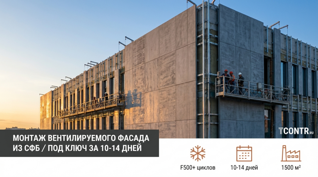 Панели из СФБ монтируются по технологии вентилируемого фасада на механический крепеж. Это «сухой» процесс. Мы можем монтировать фасад в любую погоду, круглый год. Панели приходят на объект уже готовыми, в размер, с закладными деталями. Скорость монтажа возрастает в 2 раза.