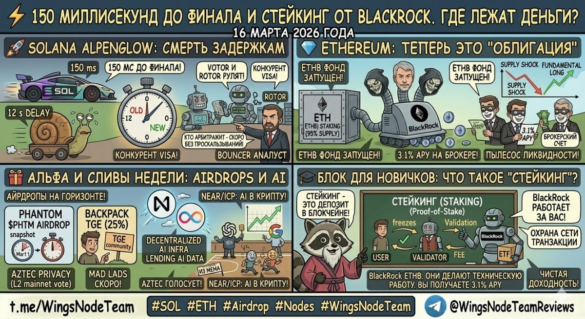 Где лежат деньги? Ранее мы обсудили макро, теперь переходим к "мясу". Пока все смотрят на графики, мы смотрим в код и отчеты фондов. WingsNodeTeam вытащил для вас самое важное из закулисья блокчейн-разработок. 💰 Solana Alpenglow: Смерть задержкам Solana готовит апгрейд Alpenglow. Что это дает? Финализация транзакций за 100-150 мс вместо нынешних 12 секунд! Системы Votor и Rotor фактически превращают SOL в конкурента Visa и мировых бирж. Если вы торгуете перп-контракты или занимаетесь арбитражем - это ваш звездный час. Скоро проскальзывания станут историей. 💰 Ethereum: Теперь это "Облигация" BlackRock запустил ETHB. Теперь Уолл-стрит может не просто держать Эфир, а получать 3.1% годовых прямо на свой брокерский счет. Это огромный пылесос для ликвидности. Когда 95% предложения ETH от ETF уйдет в стейкинг, мы увидим настоящий supply shock. Ethereum - это фундаментальный лонг этой весны. 🎁 Альфа и Сливы недели: • Phantom Airdrop: Снимок сделан 1 марта! Ждем 200 млн токенов $PHTM. Е