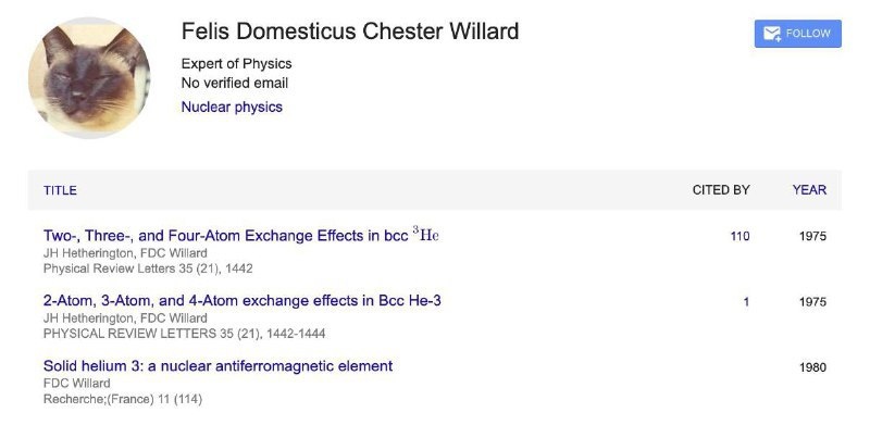 цитирований. Один исследователь просто добавил своего кота по кличке Честер в список авторов работ — и в итоге в научных базах появился настоящий физик-кот. Учёный кот подтверждён наукой. Подробнее: https://hard-tm.su/threads/153130/ 🕹HARD-TM — Подписаться