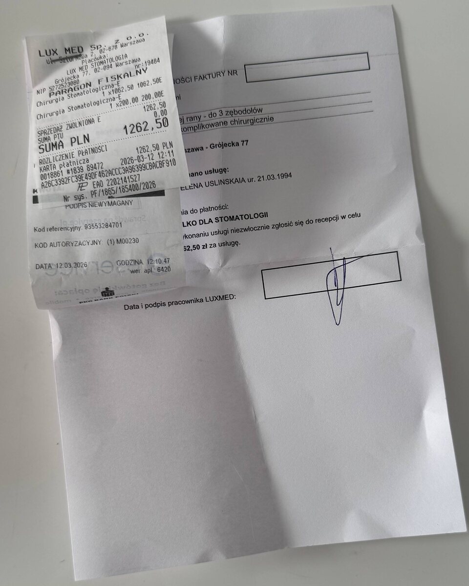⬇️ У меня страховка в Lux Med, пакет услуг. У мужа тоже и ему недавно ставили пломбу бесплатно. Я пришла на консультацию за неделю перед операцией, мне сделали томографию зуба и это входило в пакет. Однако, когда я вышла из кабинета после удаления, мне дали квитанцию на 1262 zł (это около 300€ или 27.600р). Когда на рецепции я попросила уточнить, входит ли это в пакет, сказали у вас есть скидка 15%. Я попросила пересчитать со скидкой. А это была цена со скидкой! 🤡 Наверное это моя вина, что я не спросила на консультации, сколько будет стоить удаление, и села в лужу, потому что за час до операции банк Santander заблокировал мне счет!!! 😡 и мне пришлось звонить мужу и просить его об оплате. Он был на работе в офисе, как хорошо что взял трубку и смог это сделать…. Ничего себе денек, да? Рассказать почему заблокировали счет? 💵