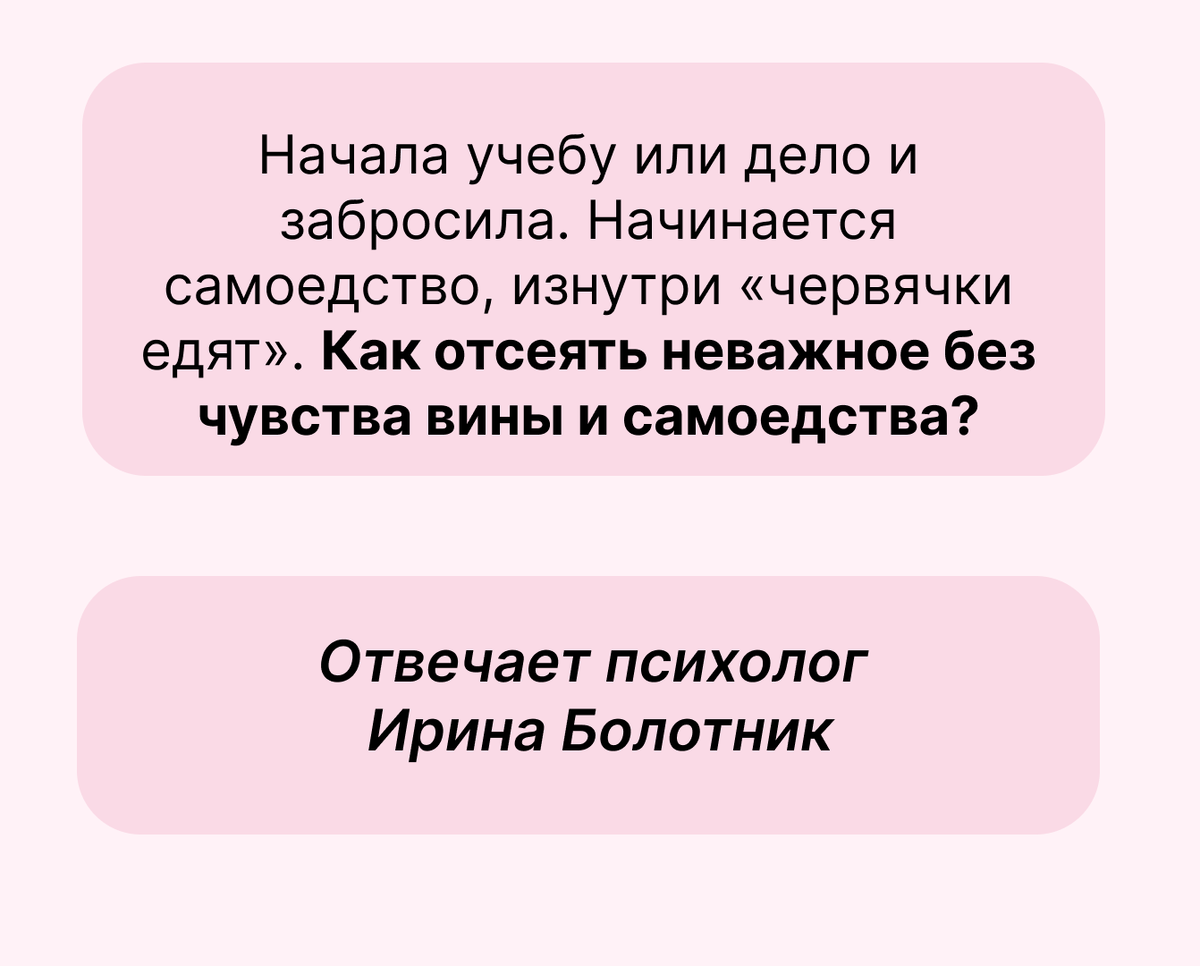 Начала учебу или дело и забросила. Начинается самоедство, изнутри «червячки едят». Как отсеять неважное без чувства вины и самоедства? Этот вопрос задали клиническому психологу Ирине Болотник в учебном чате группы «Точка опоры». Вот ее ответ: Наш мозг любит порядок и предсказуемость. Это экономит энергию и помогает выживать. Когда мы начали дело и не закончили, мозг не может выдохнуть: он держит эту задачу в рабочей памяти, в «фоновом режиме», периодически напоминая: «Эй, мы не доделали! Надо вернуться!» Именно это напоминание мы чувствуем как дискомфорт или мысли «надо доделать». А когда задача наконец завершена, мозг получает награду - выброс дофамина, гормона удовольствия, и снимает задачу с контроля. Нам становится легко. ❓Казалось бы, что плохого в том, чтобы доводить дела до конца? Есть даже пословица «Сделал дело - гуляй смело». Но проблема не в завершенности, а в мотиве. Очень часто человек заканчивает начатое не потому, что это ведет его к истинным целям, а потому, что внутри