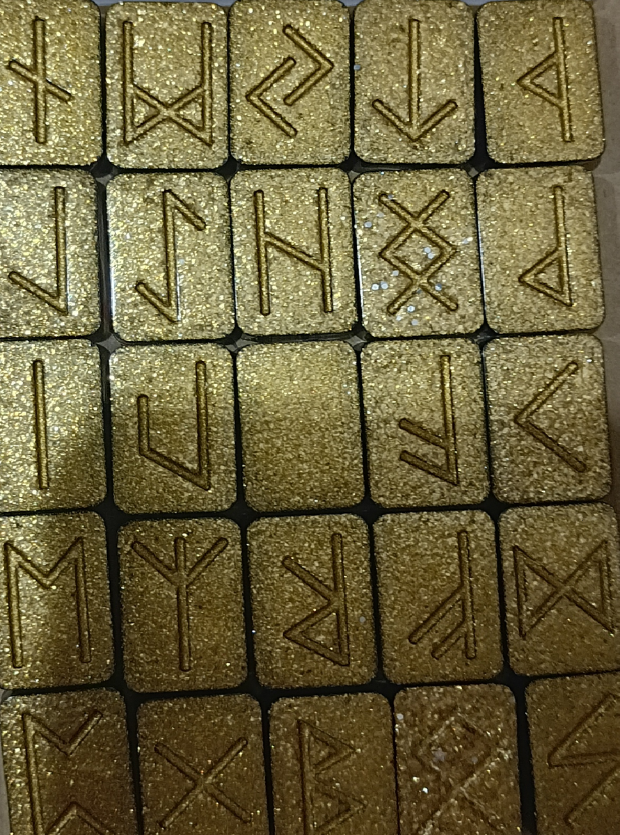 Руны — это не просто древний алфавит. Это ключи к силам мироздания, запечатленные в камне, дереве или, как в нашем случае, в сияющей «застывшей воде» — ювелирной смоле. В нашей мастерской мы создаем артефакты, которые помогают наладить связь с традицией и услышать шепот древних богов. Старший Футарк: От Феху до Отала На фото вы видите классический строй из 24 рун, дополненный пустой руной (руной Одина). Каждый символ несет в себе уникальную энергию: Почему смола и глиттер? Использование современных материалов позволяет нам создавать по-настоящему индивидуальные инструменты: Как использовать этот набор? Этот комплект идеально подходит как для глубоких мантических (гадательных) практик, так и для создания временных ставов или медитаций. Положите руну дня в карман, и пусть её золотистое сияние станет вашим проводником.