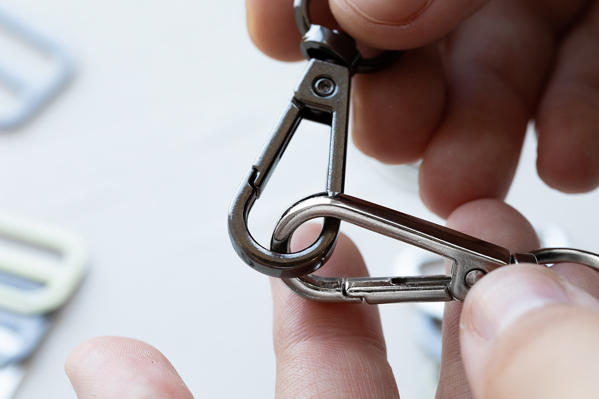В производстве сумок, рюкзаков и аксессуаров используют разные виды крепежной фурнитуры. Часть элементов фиксируют детали изделия постоянно, например люверсы или заклепки. Другие элементы делают соединение съемным. К такой фурнитуре относятся карабины швейные. Это металлический или пластиковый крепеж с защелкой. Он соединяет ремень, ручку или стропу с изделием. На фабриках используют несколько конструкций карабинов. Они отличаются формой корпуса, типом защелки и способом крепления к ремню или стропе. Имеет вытянутую форму корпуса и подпружиненную защелку, которая открывается при нажатии на рычаг. После отпускания защелка возвращается на место и фиксирует крепление. Такой тип часто используют в сумках через плечо и небольших аксессуарах. Оснащен зажимным механизмом с зубцами. Он фиксирует ткань без дополнительной прошивки. Такой вариант применяют в подтяжках, держателях бейджей и различных ремешках. В конструкции есть вращающийся элемент — вертлюг. Вертлюг дает возможность карабину своб